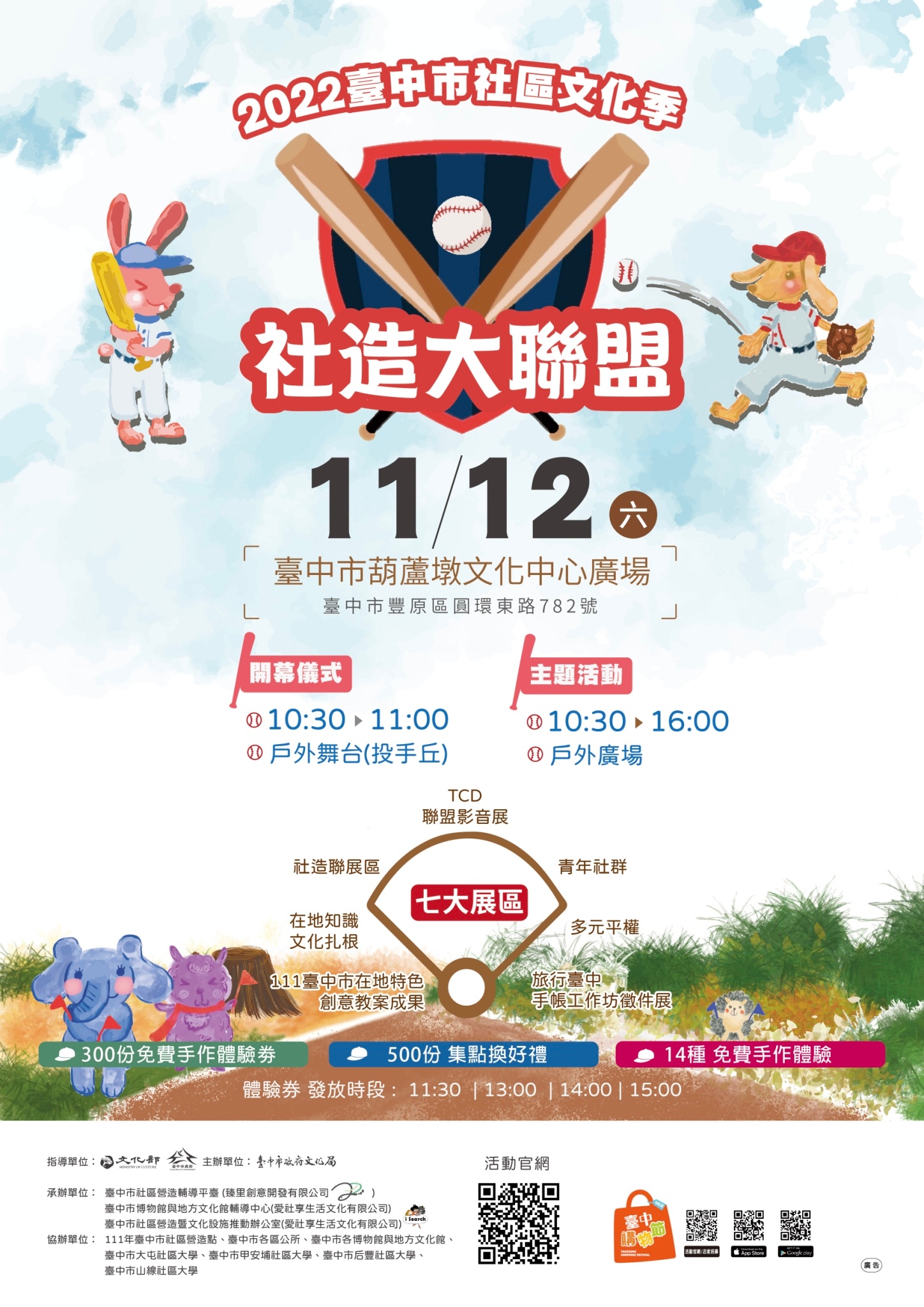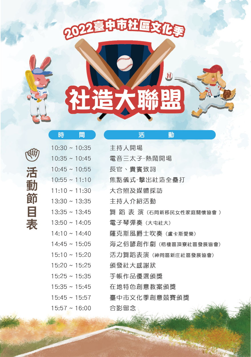 本活動由臺中市政府文化局請臺中觀光旅遊網協助宣傳。為展現臺中市社區營造成果,串聯111年度社造點、各區公所、博物館與地方文化館、社區大學等,共同呈現社區的主題特色,活動於本市葫蘆墩文化中心上午10時30分至16時舉行,歡迎踴躍參加。活動詳情請參見活動專頁(https://community.culture.taichung.gov.tw/culture/)。相關照片