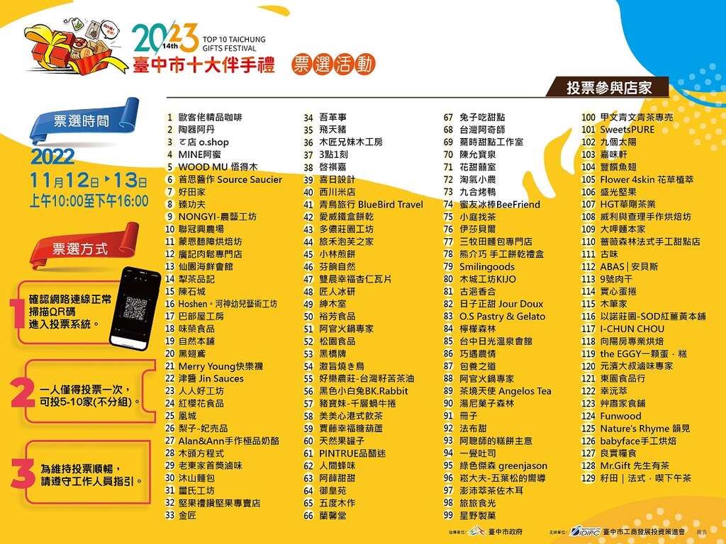「2023第十四屆台中市十大伴手禮」現場票選活動11月12、13日將於市民廣場盛大登場,此屆活動規模擴大,現場展售經專家評審嚴密遴選出的百大優質伴手禮,包含食品組、文創商品及歷屆首獎店家共計129家業者較勁,歡迎民眾參與。