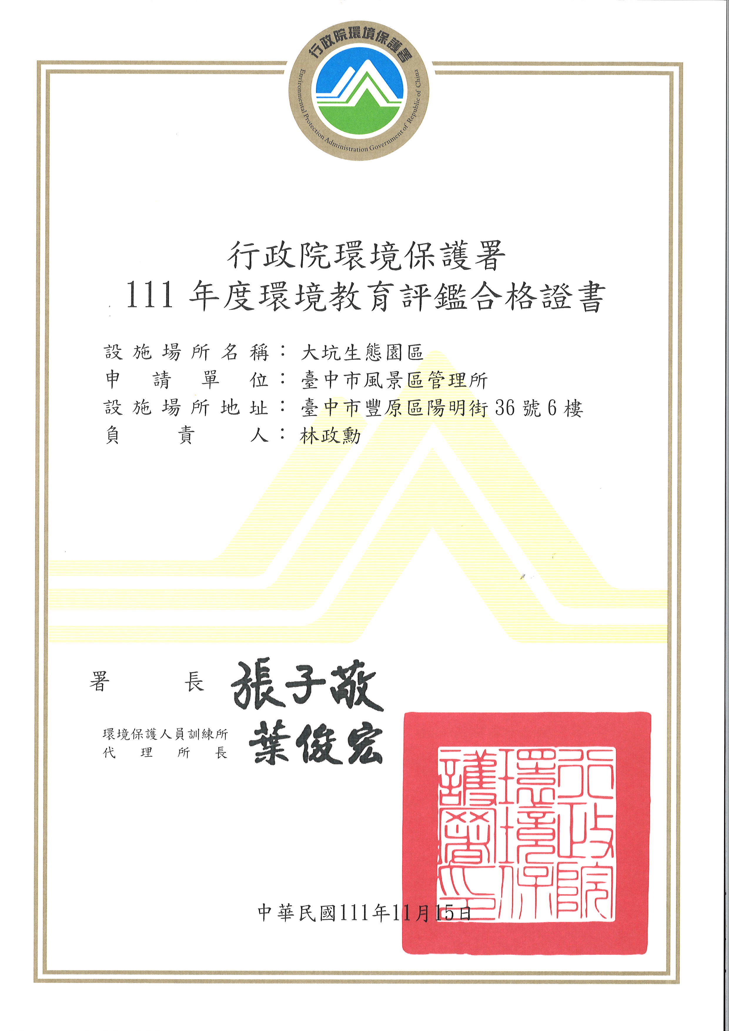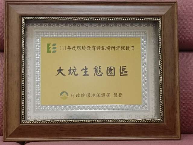 台中市大坑生態園區今年獲得行政院環境保護署「環境教育設施場所及機構評鑑」優異獎、「風景區、遊樂園、觀光工廠」類組第一名。台中市政府觀旅局表示,大坑生態園區已是五星級環教場域,今年以積極熱忱的環境教育人員、精進的課程方案、社區的連結及考量環境承載等優點,連續2次獲環保署肯定,也鼓舞導覽志工的士氣。