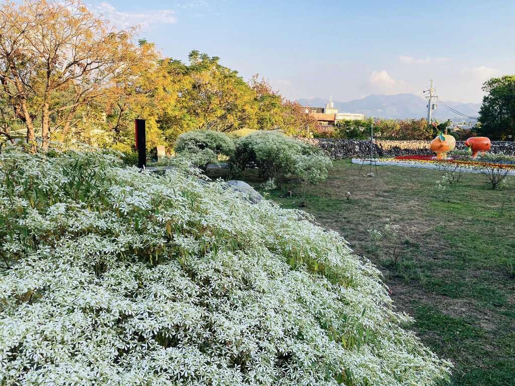 市府客委會說明,原東勢車站月台旁廣場已種植混色玫瑰花、粉撲花(合歡),文化館後方河階廣場則種有四季草花,分別為粉色四季海棠、紫色矮牽牛、紅色一串紅、黃色萬壽菊,大草坪區域目前也正進行波斯菊花籽播種養護,年底前將陸續綻放新開;另配合聖誕佳節,將應景進行植栽美化,聖誕紅、白雪木等花團錦簇美景、美不勝收。