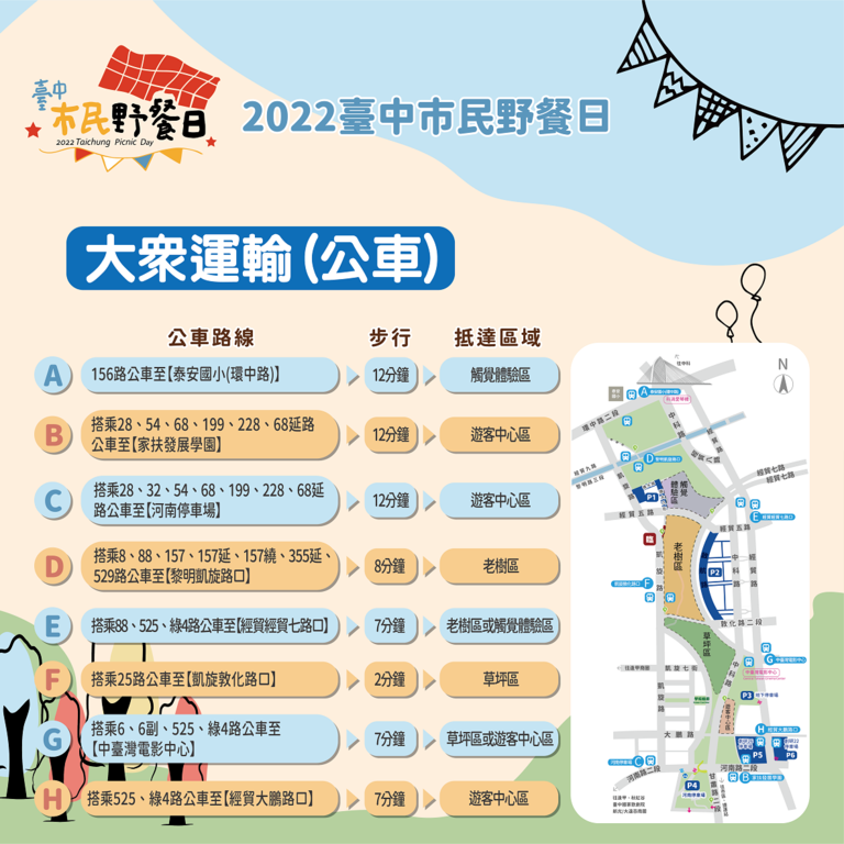 陳局長指出,民眾若搭乘公車則有6路可抵達活動現場,包含156路公車至「泰安國小(環中路)」下車,步行12分鐘至觸覺體驗區;28、32、54、68、199、228、68延、68繞路公車至「河南路停車場」、「家扶發展學園」下車,步行12分鐘至遊客中心區;搭乘8、157、529路公車至「黎明凱旋路口」下車,步行8分鐘至遊客老樹區;525路公車至「中臺灣電影中心」、「經貿大鵬路口」下車,步行7分鐘至遊客中心區;25路公車至「凱旋敦化路口」下車,步行2分鐘至草坪區。