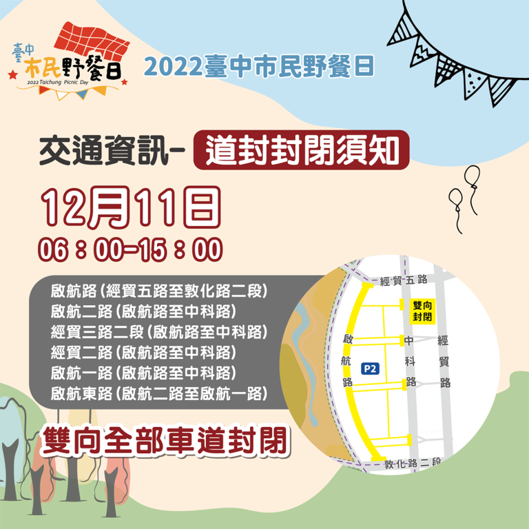 陳局長提醒,因應活動,當日僑大路(凱旋路至僑大八街)、僑大八街(僑大路至經貿五路)自早上6時至下午3時單向封閉,臨停區僅供單向進入;啟航路(經貿五路至敦化路二段)、啟航二路(啟航錄至中科路)、經貿三路二段(啟航路至中科路)、經貿二路(啟航路至中科路)、啟航一路(啟航路至中科路)、啟航東路(啟航二路至啟航一路)自早上6時至下午3時雙向全部車道封閉,請市民朋友留意。