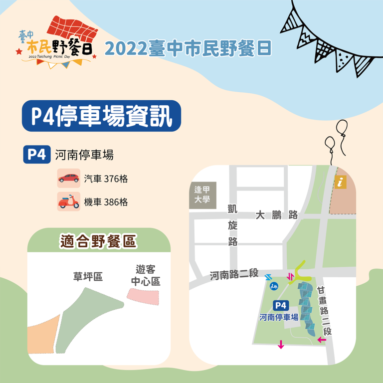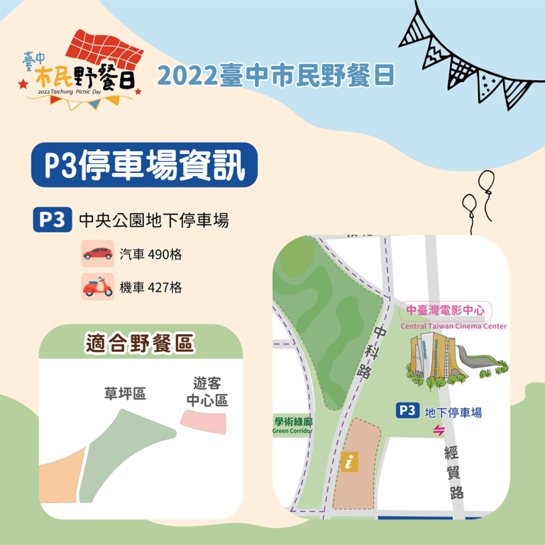 建設局表示,感謝市民朋友熱情參與線上登記,未登記的市民朋友也歡迎當天一起參加野餐活動,官網提供搭乘公車到野餐地點的資訊與鄰近的iBike站點位置,也特別規劃外送取餐臨停區,民眾可以利用外送到場輕鬆參加野餐活動,相關資訊可至活動官網(https://taichung-picnic-day.com/)下載資訊,由於中央公園場域廣大,也歡迎使用中央公園導覽APP瀏覽園區停車及遊園資訊。
