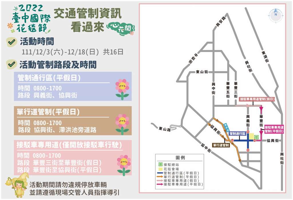 葉局長貼心提醒,參觀民眾可多利用平日搭乘接駁車前往賞花,避開人潮擁擠的假日,輕鬆寫意、自在漫遊花毯盛會,今年花海活動展期至12月18日,交通局將持續強力疏運,並與警察局通力合作,落實交通管制措施及全力疏導車流,提供遊客最好的交通接駁服務。更多活動資訊請上官方網站(https://www.flowercarpet.tw )查詢。