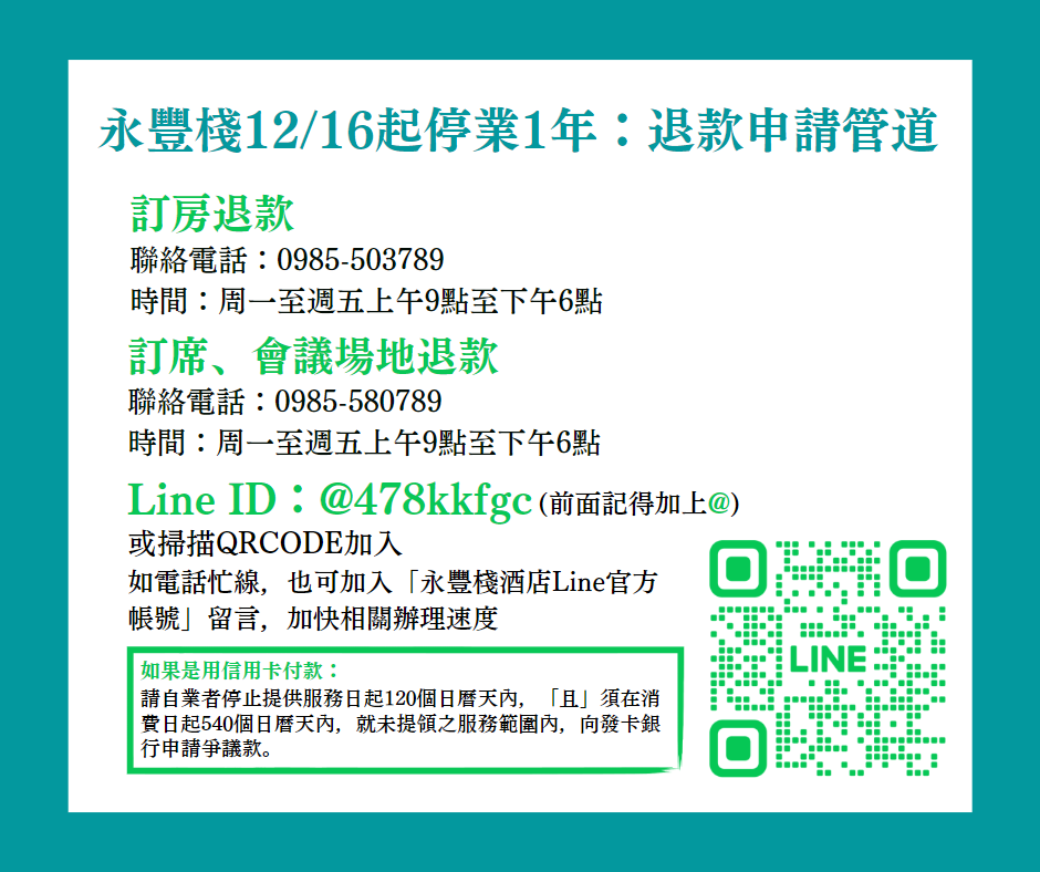 台中永豐棧酒店因經營權爭議自12月16日起停業一年,無法繼續提供餐飲、會議場地或住宿服務,台中市政府法制局提醒,消費者如有向業者預付費用訂購餐飲、會議場地或住宿,請儘速以電話或LINE向業者申請退款(會議訂席退款0985-580789、訂房退款0985-503789、LINE ID:@478kkfgc)。另若消費者是使用信用卡刷卡預付費用者,亦得依信用卡爭議款程序申請退費。