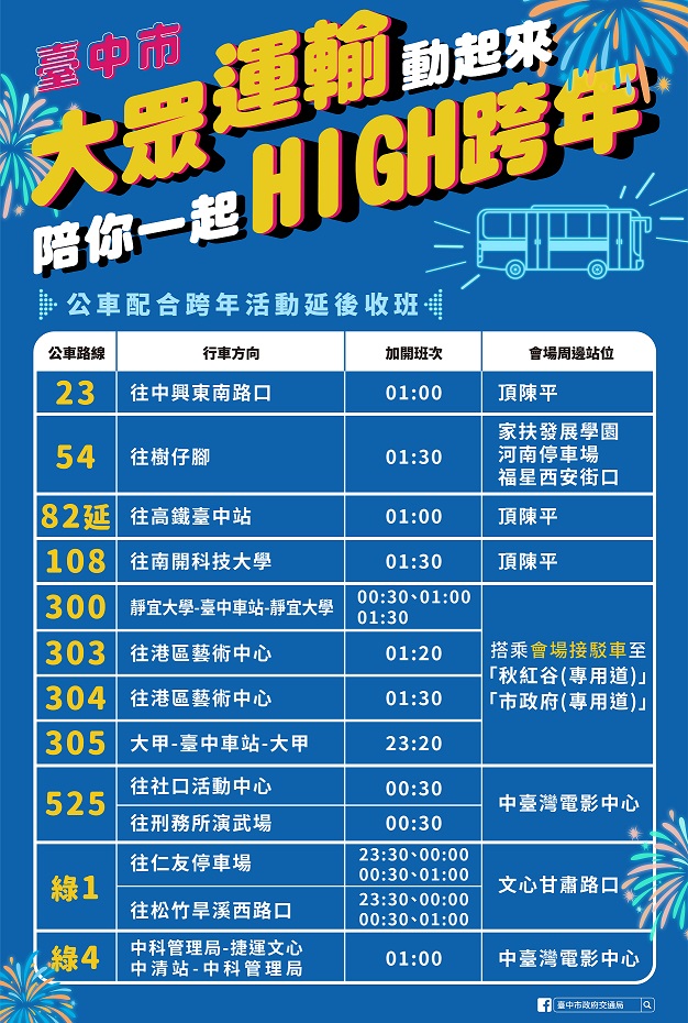 葉局長指出,市府已與捷運、公車業者及台鐵協調,配合活動時間加開班次及延後收班,捷運將延後營運至凌晨2時;市區公車則有23、54、82延、108、300、303、304、305、525、綠1及綠4等11條公車路線延後收班,台鐵則加開3班列車(南下列車2班;北上列車1班),方便疏運參加跨年活動的民眾,放心跨年、安全返家。