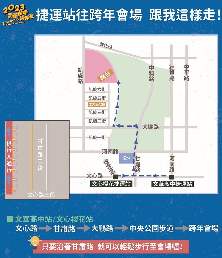 交通局補充,從捷運站出站後步行也可抵達會場,今年特別於捷運站出站後往會場方向(甘肅路)規劃行人步行空間,來參加跨年晚會的朋友可搭乘捷運至「文華高中站」或「文心櫻花站」,捷運站出站後依循指標步行經甘肅路即可抵達中央公園跨年晚會會場,現場有交通管制設施及交管人員疏導,提供民眾步行的空間;此外,搭乘計程車的民眾,市府也規劃在中央公園會場周邊規劃計程車招呼站,並自活動當日22時開始排班,離場民眾可至敦化路與啟航路口候車,或可利用「台中交通網APP」查詢計程車叫車資訊提前預約。
