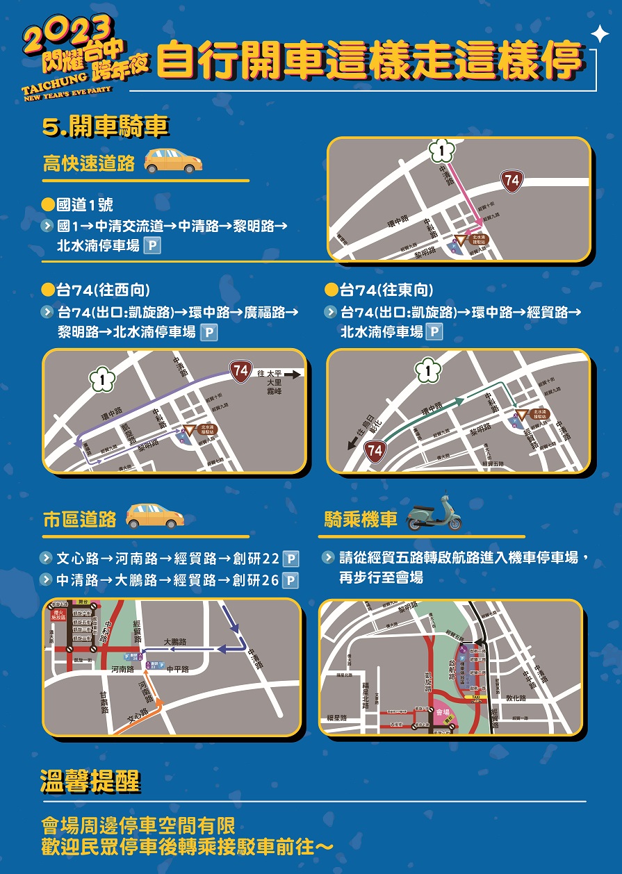 另外,為維持會場周邊道路交通順暢,市府在會場的南、北側共規劃3處汽車及1處機車的免費停車場,妥善分流南北車輛動線,建議開車行駛國道1號(下中清交流道)、台74線(下北屯一交流道)及環中路從會場北側來的民眾,可將車輛停放在北水湳停車場,停車後步行至經貿路/黎明路口搭乘「北水湳線」接駁車抵達會場;行駛市區道路從會場南側來的朋友,可將車輛停放在創研22或創研26停車場,再步行約10分鐘至會場,停車南北動線分流,交通順暢不打結;會場東北側(啟航路至中科路之間)也規劃1處機車停放區,提供約4,100個機車格位,方便民眾停好車後步行即可抵達會場。