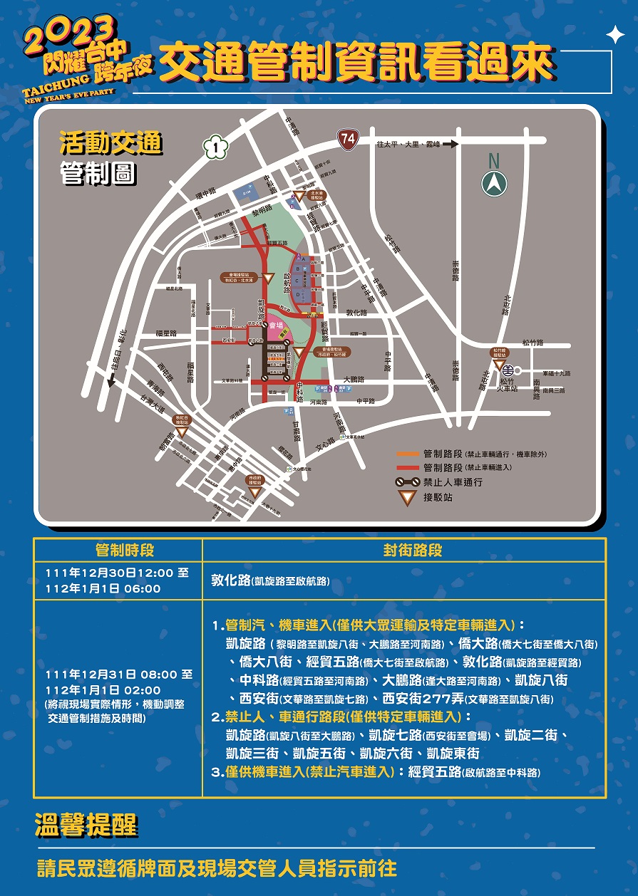 葉局長提醒,為維持跨年會場周邊交通順暢,活動當日早上8時起分階段進行周邊道路管制到隔日凌晨2時,並取締違規停放車輛,請民眾配合現場指引牌面及交管人員指揮通行,會場周邊主要道路包括河南路及文心路車流量大、容易塞車,建議市民朋友可多搭乘「捷運+接駁車」或「捷運+步行」前往會場,免受塞車困擾。相關管制資訊請至官方網站( https://taichungnewyear.com.tw/#traffic )、「台中交通網APP」查詢,歡迎大家來水湳中央公園跨年。
