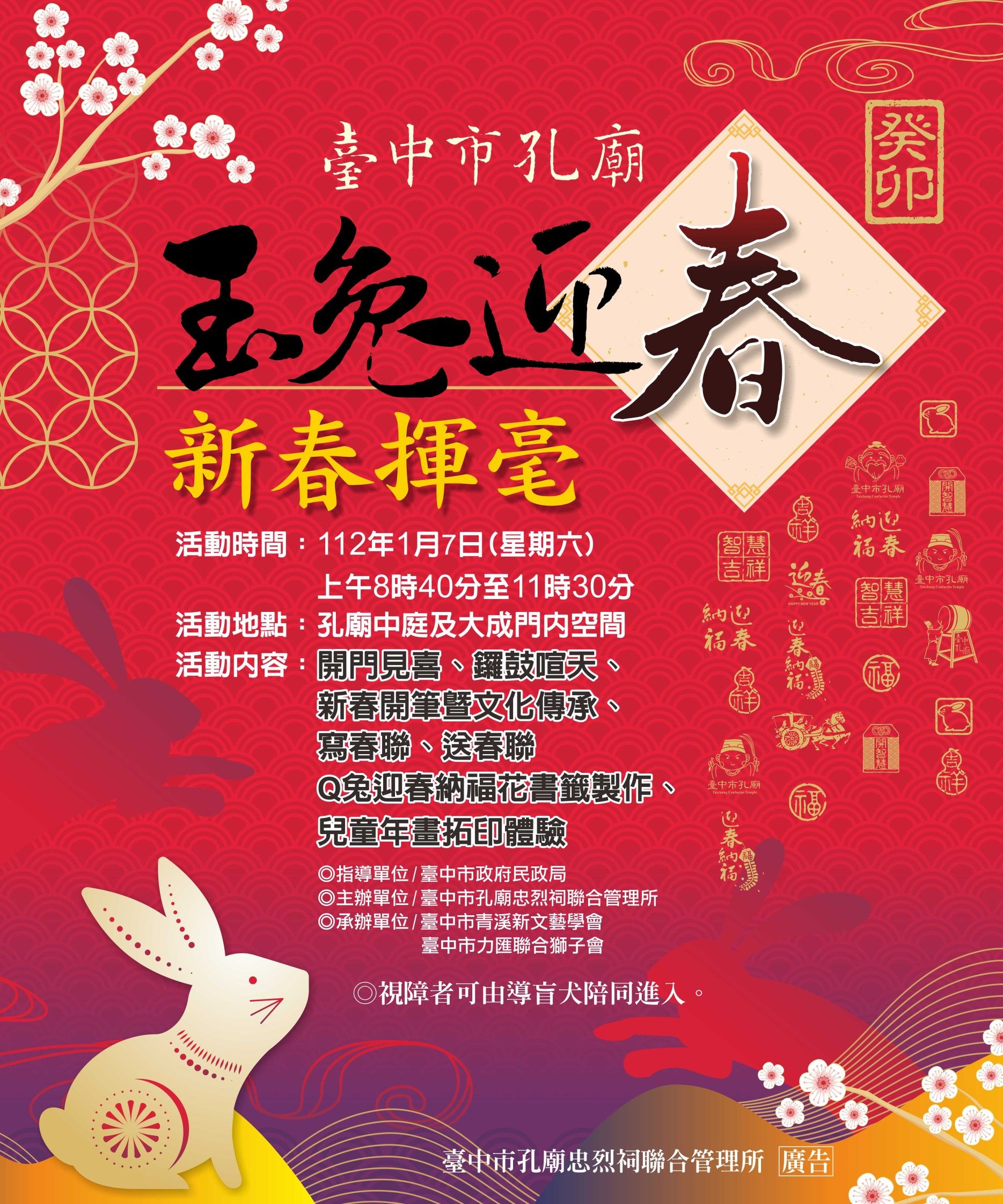 農曆春節將至,揮別虎年迎接兔年到來,台中孔廟結合台中市青溪新文藝學會及台中市力匯聯合獅子會,將於1月7日上午8時40分舉辦癸卯年「玉兔迎春,新春揮毫」活動,邀請書法界多位名家現場揮毫,讓民眾免費索取年字年畫,增添年節福氣。台中孔廟表示,現場將準備600份春聯免費贈送,活動當日前200名入園民眾還可兌換「開運吉祥如意紅包吊飾」乙份,歡迎民眾踴躍參與。