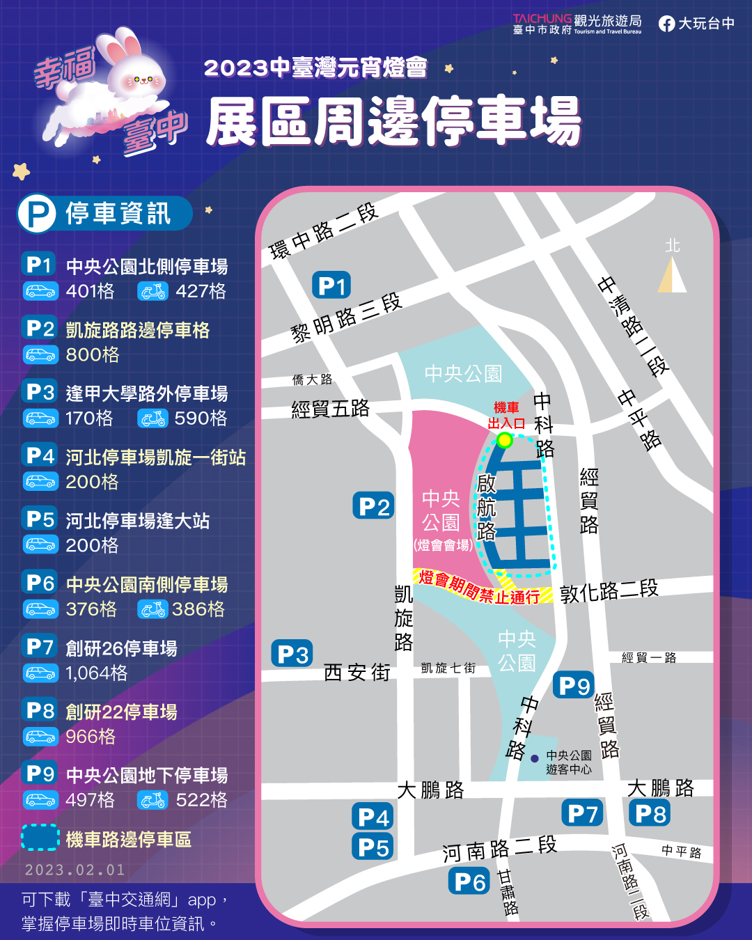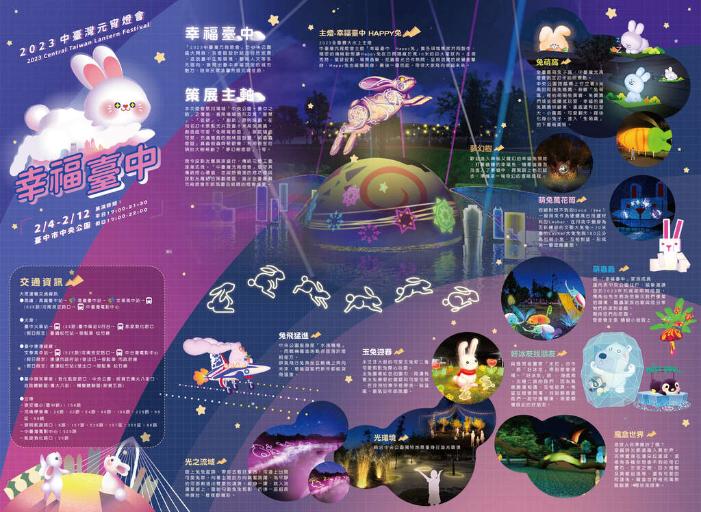 2023中臺灣元宵燈會以「幸福臺中」為主軸,佈置7大主題燈區、逾30座燈組,以環境友善議題結合場域特色,打造出專屬中央公園地形地貌的璀璨燈區;白天是大型裝置藝術公園,夜晚則搖身變成耀眼花燈樂園,交織展現臺中自然、人文之璀璨魅力,並兼具疫後城市重生、經濟重振的意義,邀請全臺民眾體驗臺中舞彩絢麗的燈光饗宴,感受幸福宜居的城市魅力。