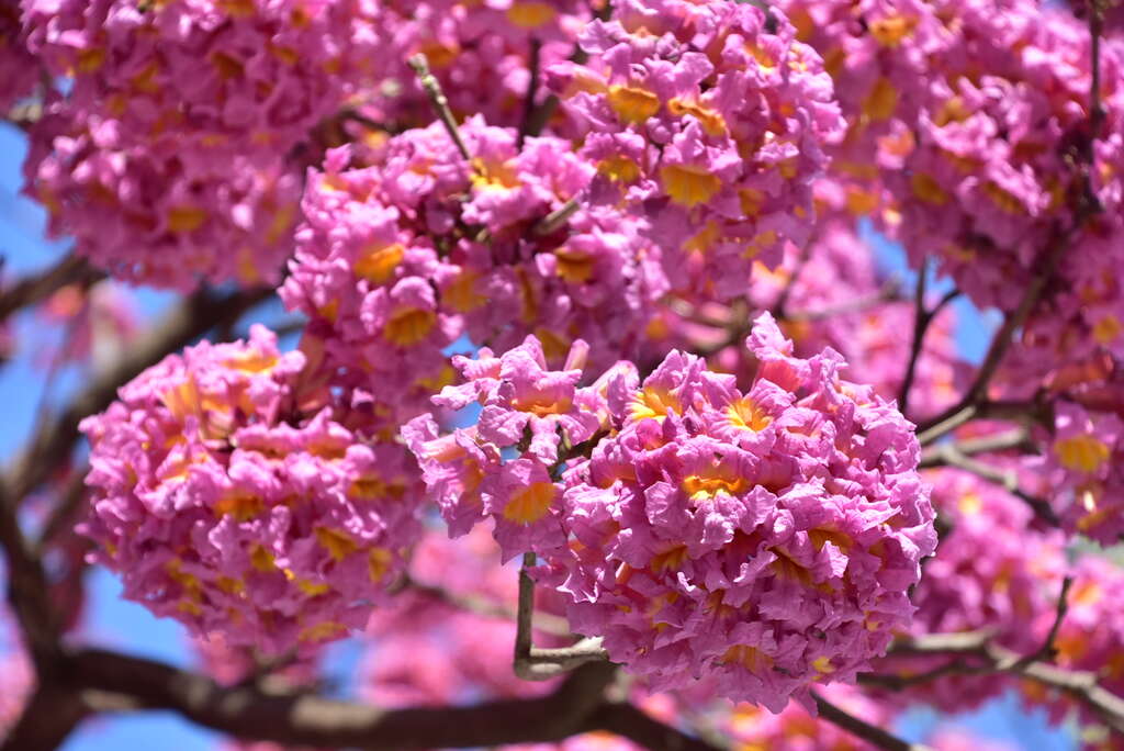 陳局長表示,紫紅色系風鈴木是常見的道路及公園景觀樹種,在春季時綻放,點綴著台中城市景觀,嬌艷的花朵獨展姿態,高掛樹梢宛如紫紅色棉花糖般,深獲網美及大、小朋友喜愛,提醒想拍美照的民眾千萬別錯過這一波花期;緊接著3、4月黃花風鈴木將接力爭艷,為市容增添另一種活力與熱鬧感。