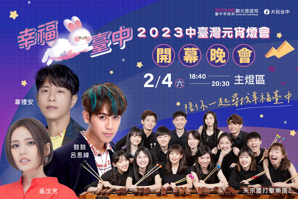 觀旅局表示,2月4日開幕晚會卡司陣容堅強,除了邀請到國家級表團朱宗慶打擊樂團2精彩開場,還有創作才子韋禮安、魔幻男聲鼓鼓呂思緯、療癒精靈吳汶芳接力開唱。此外,特別安排歡樂小丑氣球達人秀、石虎家族&MOMO家族親子派對,還有燈會Happy兔提燈DIY教學,豐富的展演與親子活動,大、小朋友都滿意。