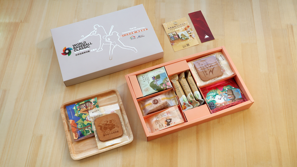 黃總幹事說明,工策會致力將台中伴手禮推廣至國際,這次更限量推出「WBC台中市十大伴手禮聯名禮盒」贈予外賓,禮盒從外觀設計、內容選品都由工策會一手包辦,甚至摺紙盒、包裝出貨也是由工策會自行招募志工協力完成。此外,禮盒內7項伴手禮更是大有來頭,包括青鳥旅行─經典花生及芝麻蛋捲、法布甜─人氣馬卡龍鳳梨酥、歐客佬精品咖啡─遊台中掛耳咖啡包、華剛茶葉─最高金賞茶包、小林煎餅─特製WBC煎餅、鴻鼎菓子─鳳凰酥、光山行─漆器紋書籤,全都是「台中市十大伴手禮」選出的優秀品牌,盼讓外國球員、大聯盟貴賓對台中美食留下深刻印象。