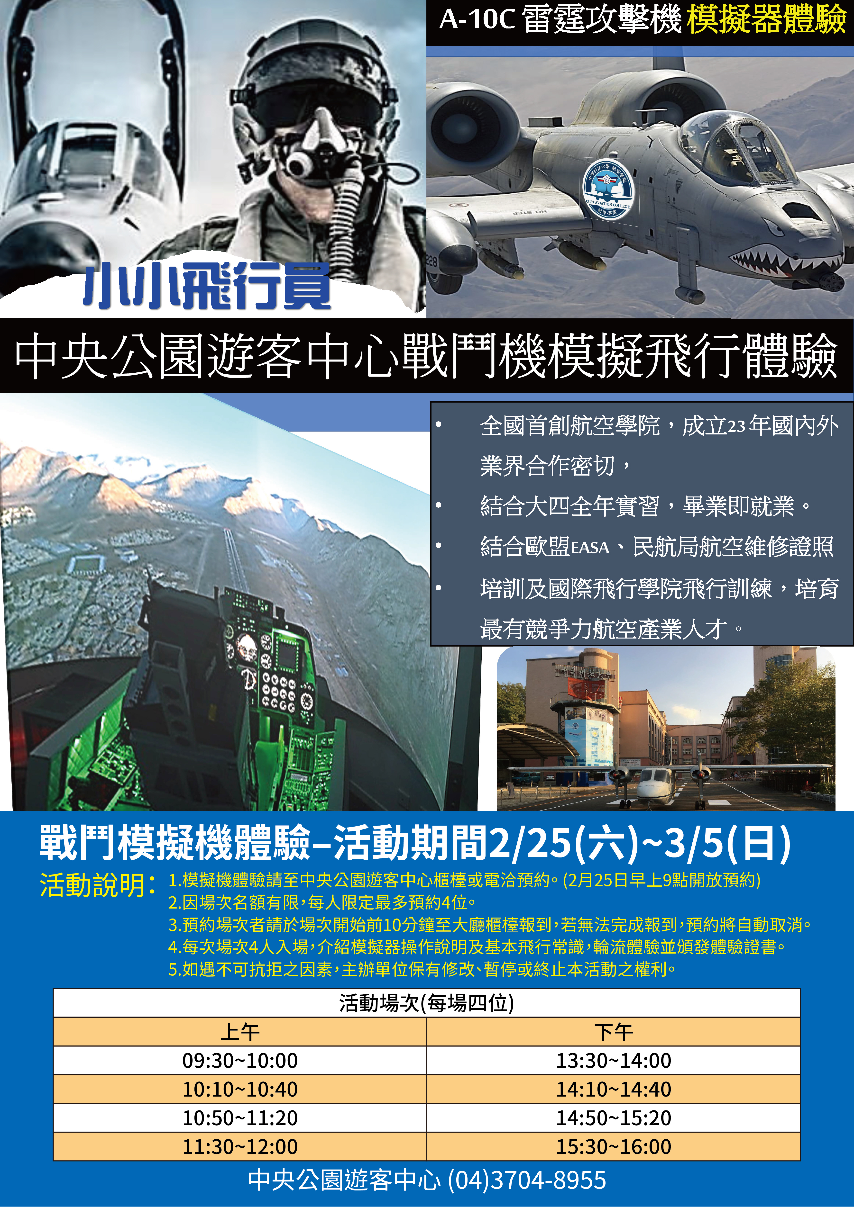 陳局長說明,中央公園遊客中心將陸續推出系列特色展覽及活動,此次戰鬥機模擬飛行體驗展期至3月5日止,已吸引許多遊客參訪並大獲好評,喜愛飛機的遊客可把握最後時間體驗駕駛戰鬥機,留下駕駛戰鬥機的難得畫面,開放駕駛時段自上午9時至下午4時。