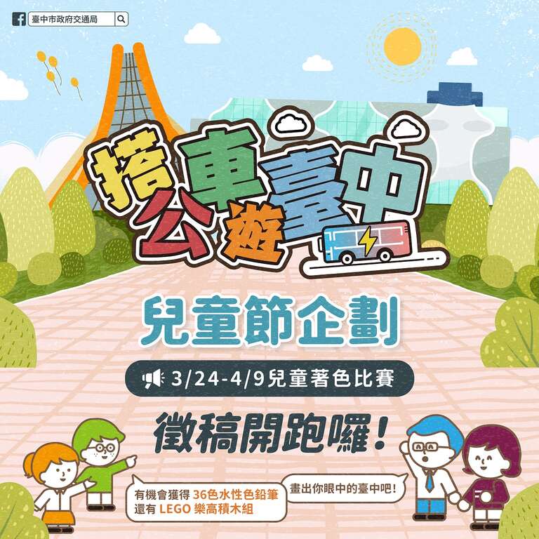 一年一度兒童節慶即將到來,台中市政府交通局首度舉辦「搭公車,遊台中」系列活動,第一波以線上彩繪徵件登場,希望從體驗搭公車的過程,畫出「你眼中的台中,是什麼樣子?」小朋友完成創作後線上投稿完成上傳步驟,即可獲品牌36色水性色鉛筆抽獎機會,並同時選出5個最有創意的得獎作品,送出小朋友LEGO樂高積木組,歡迎小朋友呼朋引伴一起來參加。