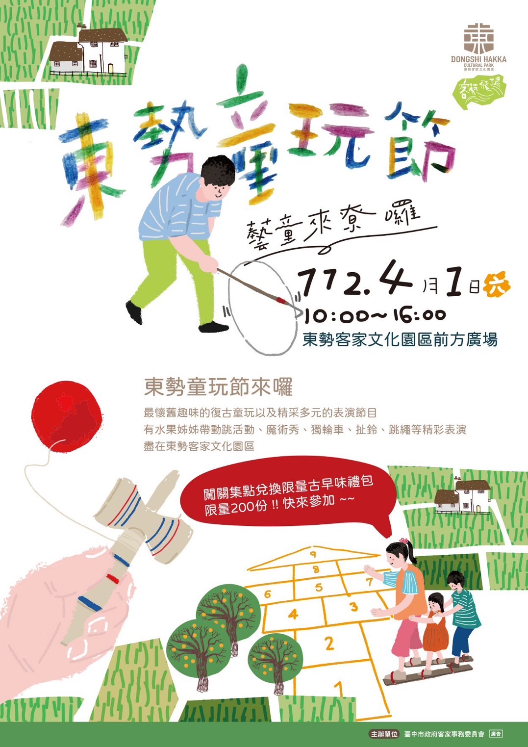 為迎接五天清明連假與慶祝兒童節,台中市政府客家事務委員會將於4月1日在東勢客家文化園區廣場舉辦「東勢童玩節-藝童來尞囉」活動,10項童玩闖關遊戲和文創市集、藝文團隊精彩演出,歡迎大小朋友來東勢歡度兒童節!