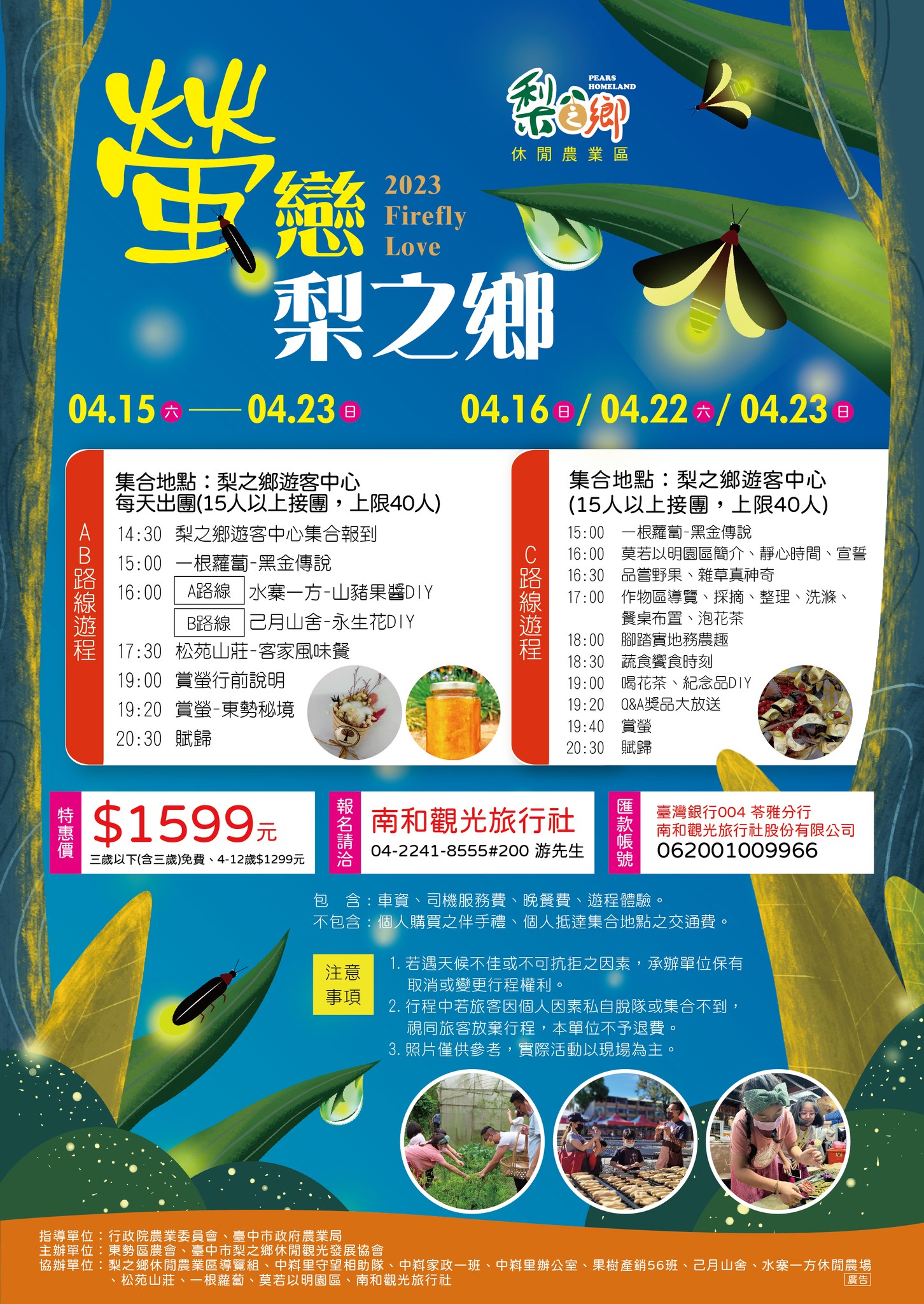 農業局表示,東勢區農會表示梨之鄉休閒農業區將於4月15日至23日舉辦「第8屆螢戀梨之鄉活動」,結合旅行社採預約報名,活動由休閒農業區內的4個農家共同推出3條各有特色的深度農遊體驗,A路線由「水寨一方休閒農場」推出山豬果醬體驗活動,採用農場種植的桶柑進行製作,適合大小朋友一同動手DIY。B路線由「己月山舍」推出絕美手作永生花體驗,透過特殊技術完整保存鮮花的質感,送禮自用兩相宜;A、B路線的晚餐均安排在「松苑山莊」享用「吃在地、食當季」的客家美食。