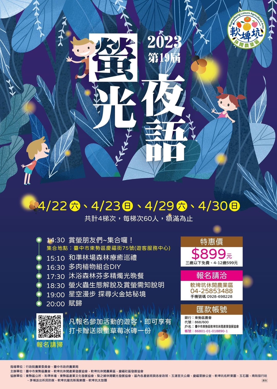 軟埤坑休閒農業區則於4月22日在和準林場舉辦「2023第19屆螢光夜語活動」,活動內容包含森林療育巡禮與多肉植物組合DIY活動,晚餐在芬多精滿滿的森林中享用浪漫的燭光晚餐,補足能量後由專業導覽人員為遊客解說螢火蟲生態與賞螢須知,開啟探尋火金姑秘境、漫步螢光的賞螢體驗。報名請洽:台中市東勢區軟埤坑休閒產業發展協會04-25853488。官方網站:http://www.rpk.com.tw/ ;農業易遊網: https://ezgo.coa.gov.tw/zh-TW/Front/Agri/Detail/35 。