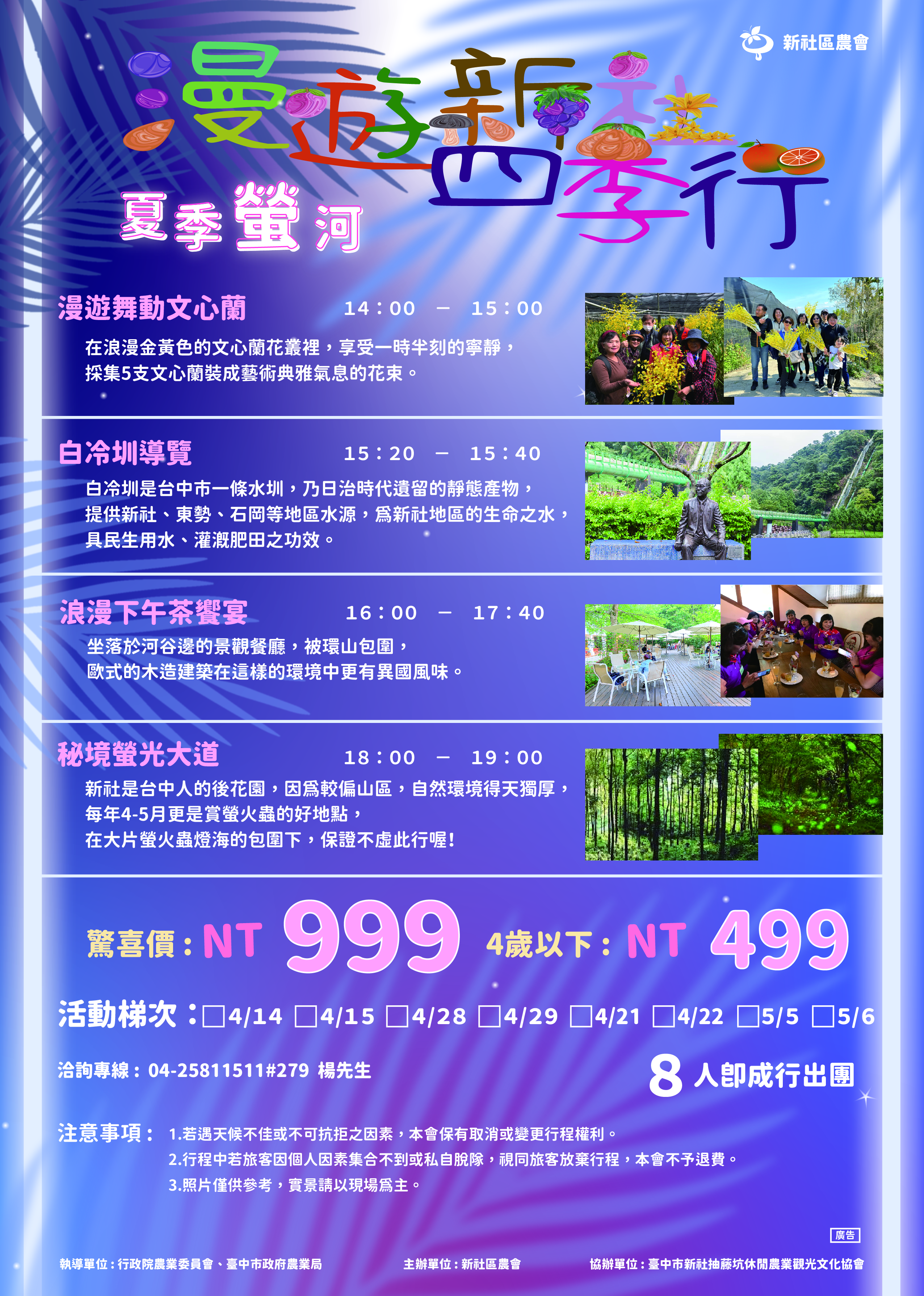 新社區農會表示,今年輔導抽藤坑休閒農業區推出4月週末限定一日賞螢活動,活動當日下午帶領遊客造訪浪漫金黃色的文心蘭園及導覽解說白冷圳設置歷史緣由與當地農業發展的鏈結,傍晚時刻讓遊客在群山環繞的浪漫氛圍中品嚐下午茶,夜幕降臨中走進螢光大道。報名電話:新社區農會楊先生04-25811511分機279;農業易遊網:https://ezgo.coa.gov.tw/zh-TW/Front/News/Detail/2500 。