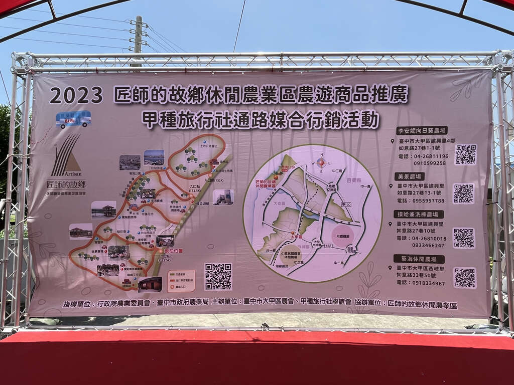大甲區農會表示,此次舉辦的旅行社通路媒合行銷活動,邀請「匠師的故鄉休閒農業區」的特色農場展示獨一無二的匠師特色,包含「螃蟹的匠師-葵海休閒農場」在農場內就可貼身觀察到豐富濱海生態、「包子的匠師-美景農場」以在地農產製作特色點心,「藺草的匠師-李安妮向日葵農場」積極推動傳統藺草編織,「窯烤的匠師-摸蛤兼洗褲農場」提供摸蜆體驗及傳統控窯體驗;其中葵海休閒農場為已取得許可登記證的休閒農場外,其餘三個農場為取得行政院農業委員會認證的特色農遊場域,均是民眾農遊體驗場域的首選。