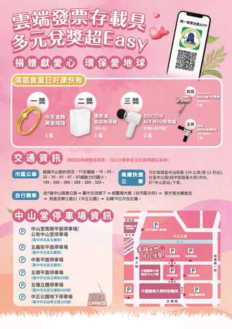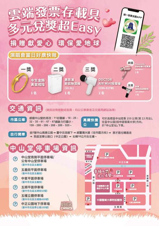 地稅局說明,演唱會現場還有抽獎活動,獎項有黃金戒指、除濕機、按摩槍、吹風機、筋膜槍等好禮,無法到場的民眾可透過地稅局「中市稅輕鬆」臉書粉絲專頁線上觀看演唱會直播,還有機會抽中全聯禮券600元。此外,活動當天現場設有租稅宣導及「守護台中 廉潔幸福」廉政小遊戲攤位,除傳達市長盧秀燕廉潔施政理念外,也一併宣導「台美21世紀貿易倡議反貪腐章」的內容與價值,促進民眾瞭解與認同。