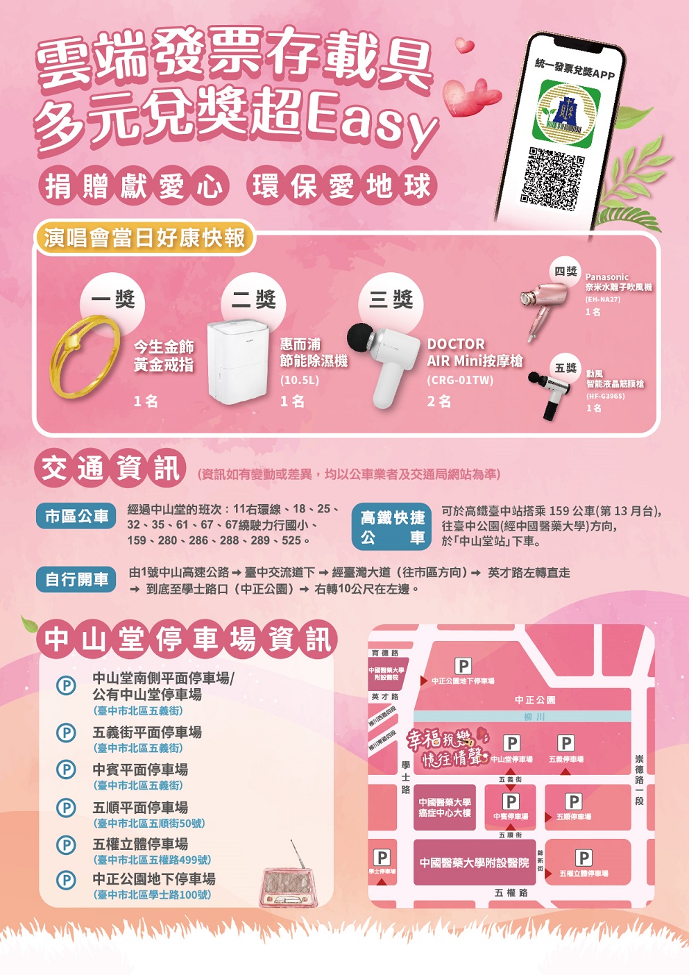 台中市政府地方稅務局將於7月2日晚上7時30分,在台中市中山堂舉辦「幸福稅樂 憶往情聲」情歌演唱會,邀請魏嘉瑩、好樂團、蔡佩軒、張若凡及Shawn尚融同台演唱。民眾只要在6月15至29日到地稅局各分局或指定圖書館,捐贈今年5月至6月紙本發票正本8張或雲端發票5張,即可兌換入場券1張,募得發票將全數捐贈給台中市慈善機構,歡迎民眾共襄盛舉,響應社會公益。