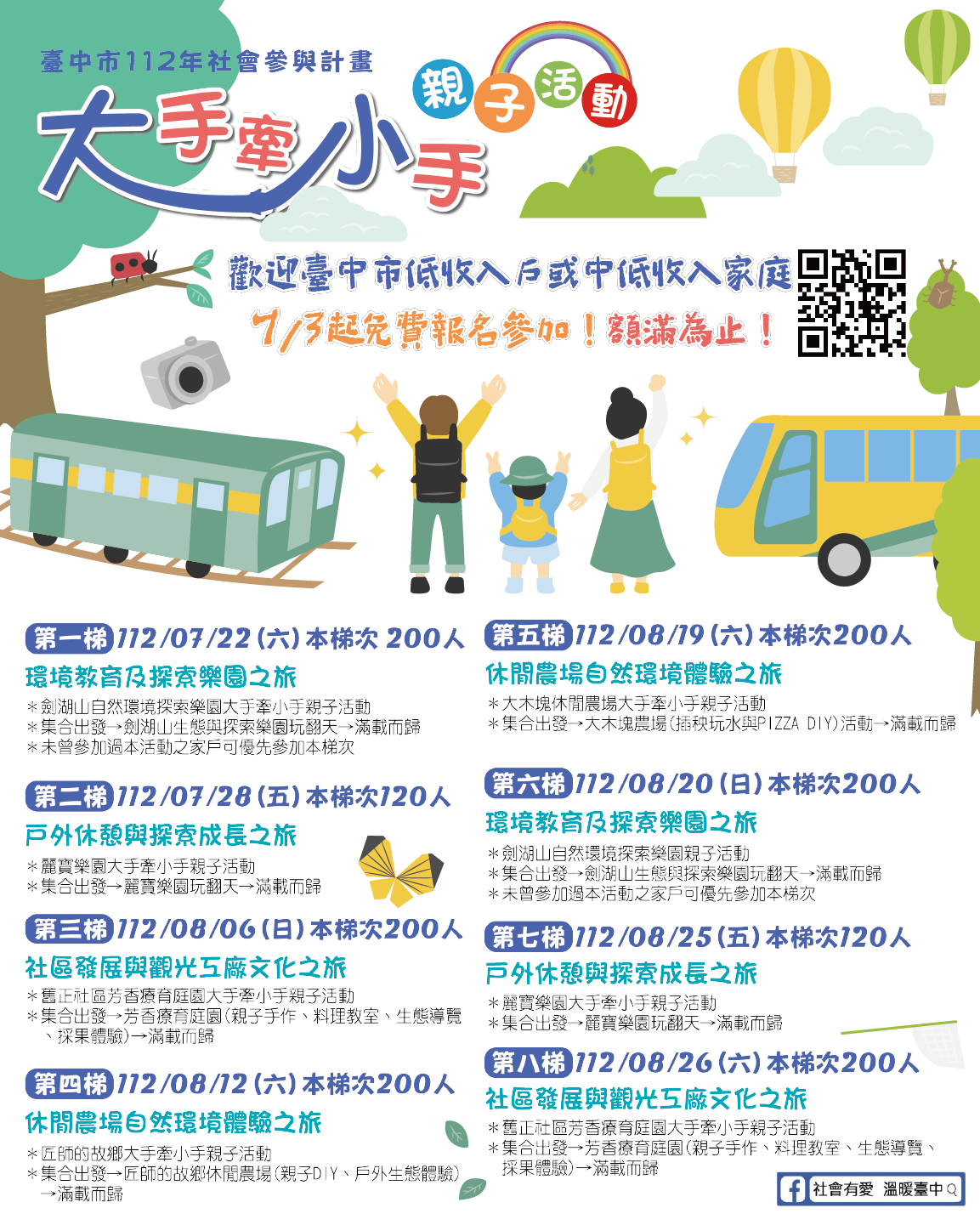 社會局補充,今年還有另一個系列「小手牽大手圓夢之旅」,報名資格同樣是列冊台中市的低收入戶及中低收入戶家庭,須親子共同報名,家戶報名人數上限 5 人。自行規劃家族圓夢之旅,活動申請書經審核通過後,每1戶每1人提供800元旅遊基金,1戶最高補助4,000元,7/21起開放申請。有關「大手牽小手親子活動」和「小手牽大手圓夢之旅」報名資訊,可查詢台中救國團官方網站(https://tcctc.cyc.org.tw),或洽台中救國團活動組李先生04-23112121分機1131。