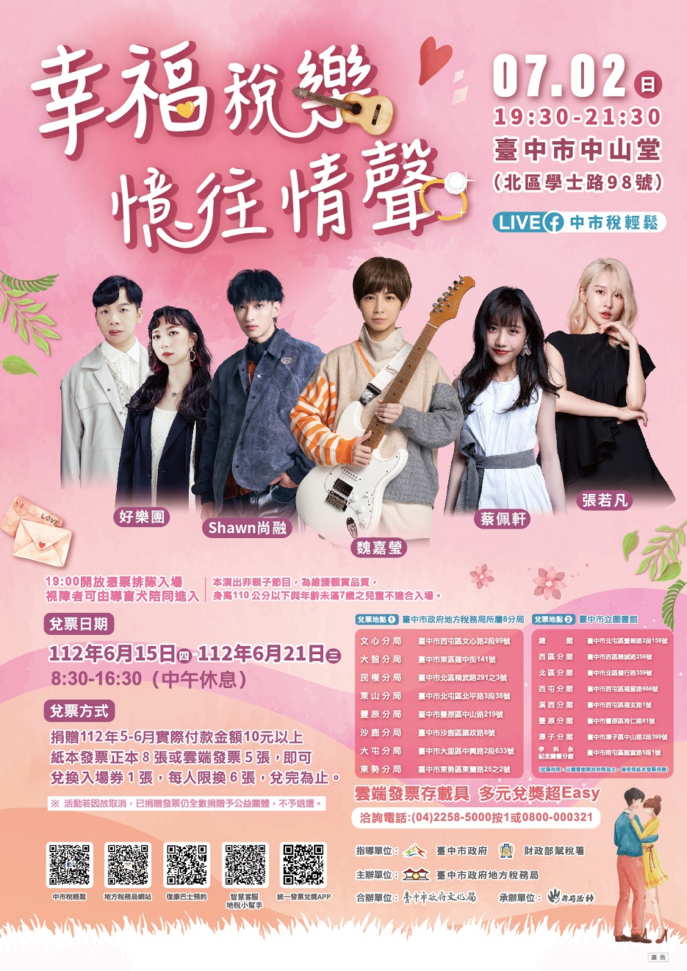 台中市政府地方稅務局將於7月2日晚上7時30分,在台中市中山堂舉辦「幸福稅樂 憶往情聲」情歌演唱會,當天晚上7時開放已兌票的民眾可憑票排隊入場,還沒有入場券的民眾,現場開放兌換,只要捐贈今年5月至7月實際付款金額10元以上紙本發票正本8張或雲端發票5張,即可兌換入場券1張排隊入場。數量有限,兌完為止。
