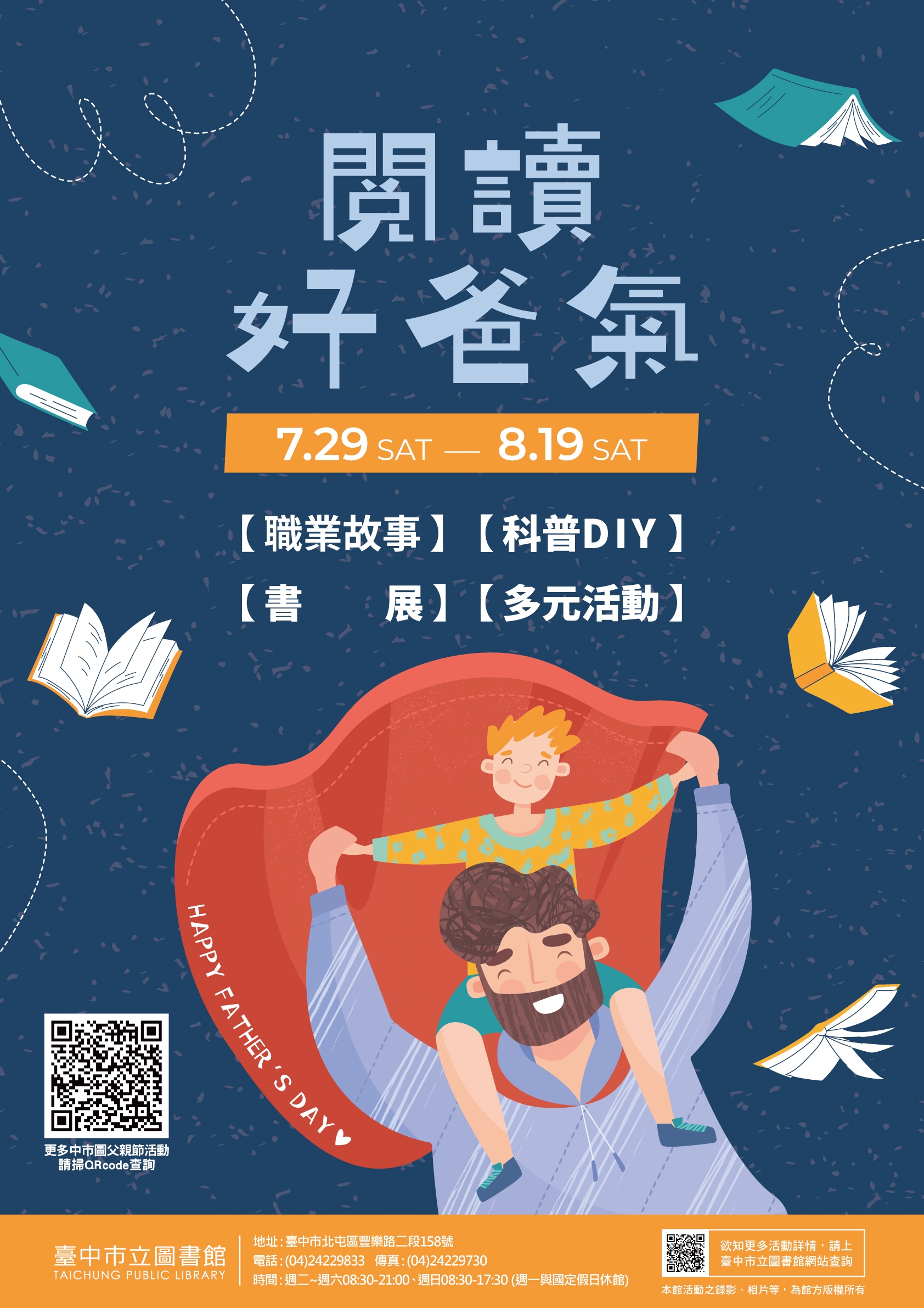 父親節即將到來,台中市立圖書館以「職人/科普」為主題,推出科普DIY、書展、臉書抽獎等「閱讀好爸氣」系列活動,歡迎爸爸帶孩子到圖書館,共享親子時光;此外,台中市眷村文物館8月5日、6日則有「老派爸比 Chill HiHi」活動,邀請爸爸們穿上古著逛市集、上餐館 !