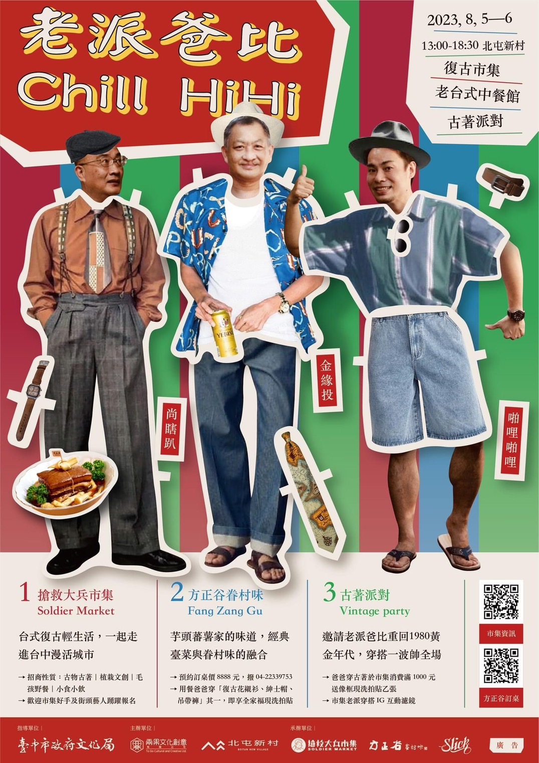 文化局指出,除到圖書館享受親子閱讀時光,還可以和爸爸來場老派約會!台中市眷村文物館8月5日、6日舉辦「老派爸比 Chill HiHi」活動,有復古市集、老台式中餐館、古著派對,邀請爸爸們重回1980黃金年代,穿上紳士帽、吊帶褲、復古花襯衫,一起逛復古市集、品嚐老台式中餐館。