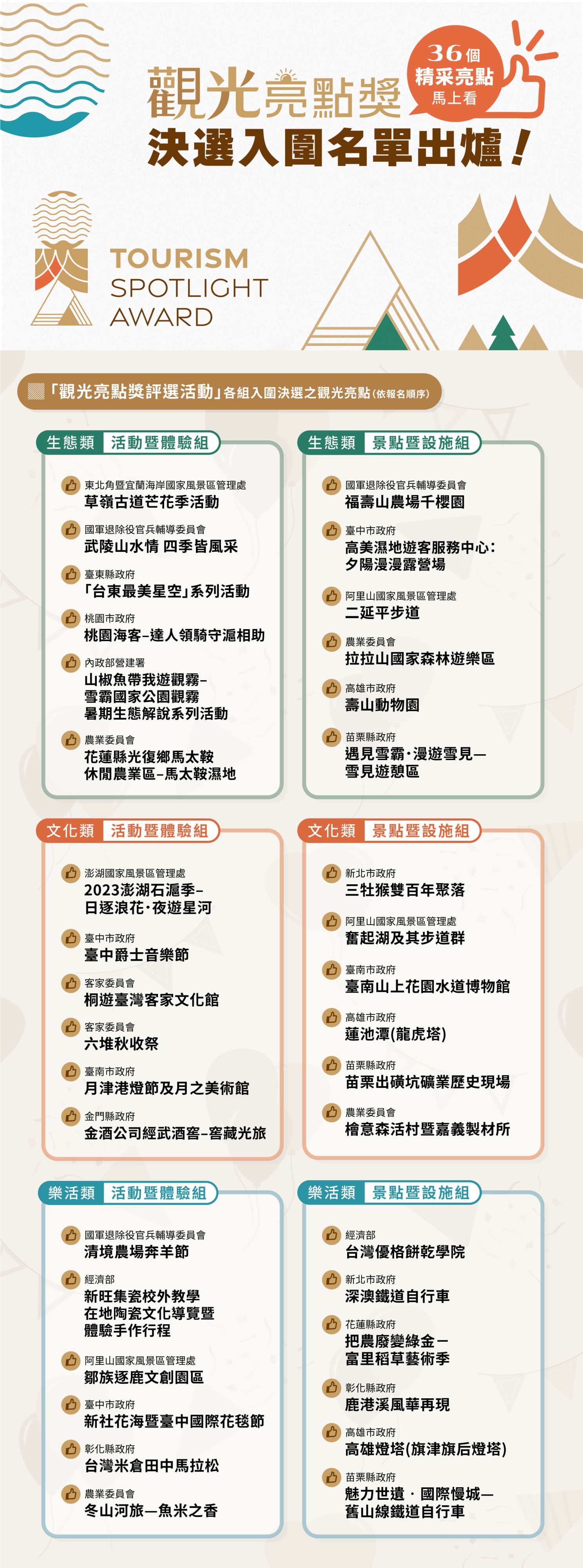 交通部觀光局今年結合中央各部會及縣市政府觀光資源舉辦「觀光亮點獎」評選,將各機關所推薦123個觀光亮點分為生態、文化及樂活3大類,每類別再分為「活動暨體驗組」及「景點暨設施組」2組,共6組參與評選。台中市政府建設局推選的「高美濕地遊客服務中心:夕陽漫漫露營場」經過激烈的第1階段全民網路票選及專家學者書面評選,於「生態類-景點暨設施組」脫穎而出入圍決選,並於日前辦理現地考評,期待能為市府奪得佳績。