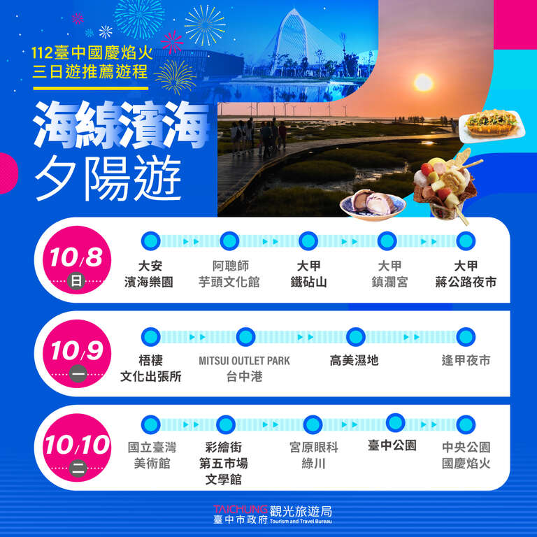 為慶祝112年國慶焰火在台中施放,市府觀光旅遊局除規劃精彩活動外,並特別推薦三套「三天兩夜」遊程方案,包含「山城爵士悠揚行」、「屯區親子歡樂行」和「海線濱海夕陽遊」,讓遊客趁國慶連假玩得暢快、玩得有深度,再到中央公園欣賞璀璨焰火,體驗台中觀光旅遊特色與魅力。