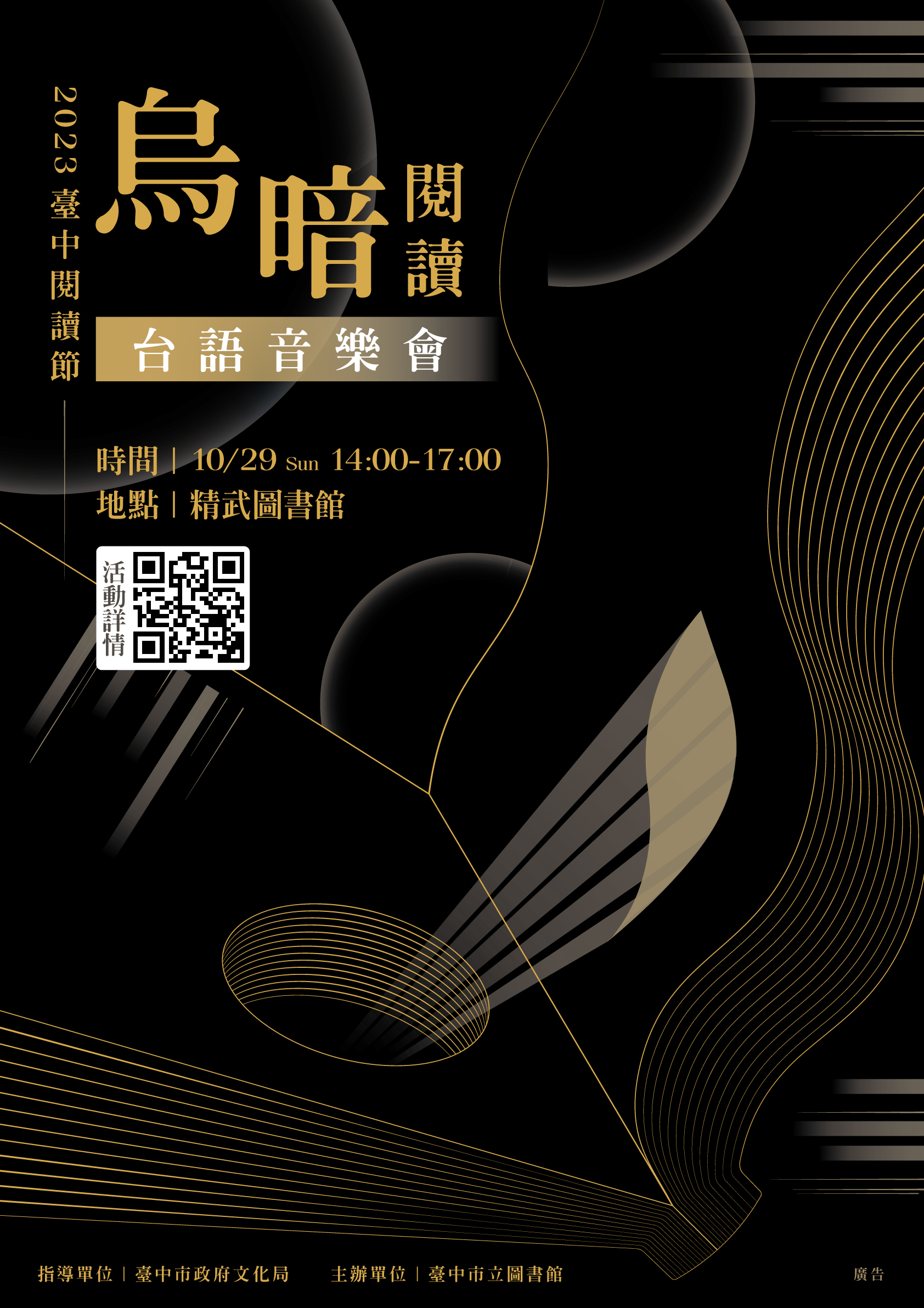 中市圖說明, 2023台中閱讀節今年以「植 x 職閱讀」為主題,透過閱讀邀民眾深入瞭解各行各業、領略職人「頂真打拼」精神,此次「烏暗閱讀音樂會」特別邀請視障歌手展現專業,接下來11月將推出各圖書館的「一館一展」,以及2場「植x職閱讀講座」分別在豐原分館和精武圖書館登場,歡迎踴躍參加,更多活動訊息請至官網(https://pse.is/58s3ym)查詢。