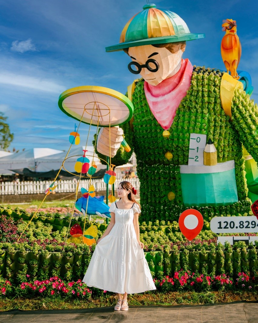 網紅茉莉在Instagram上也分享今年花毯節如何簡單捕捉迷人視角。首先,站在生態勇者放大鏡下方拍攝,照片彷彿置身巨人國;或站在大地巨人側邊,可以體驗像是被擁入懷抱的感覺;而工藝女神其鏤空設計襯托著背後美麗山脈及藍天白雲齊下的自然美景,構圖好似充滿故事性的畫作。