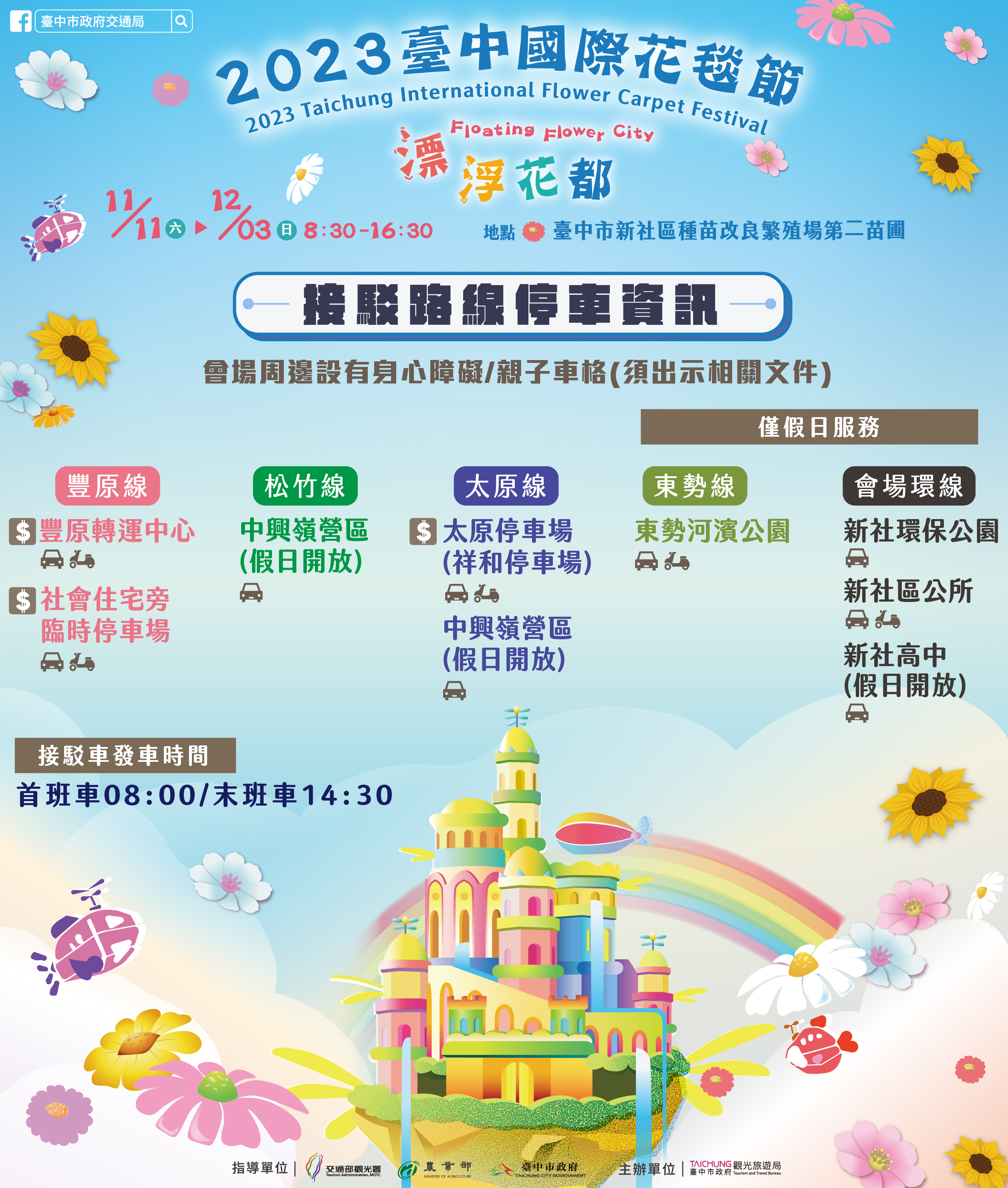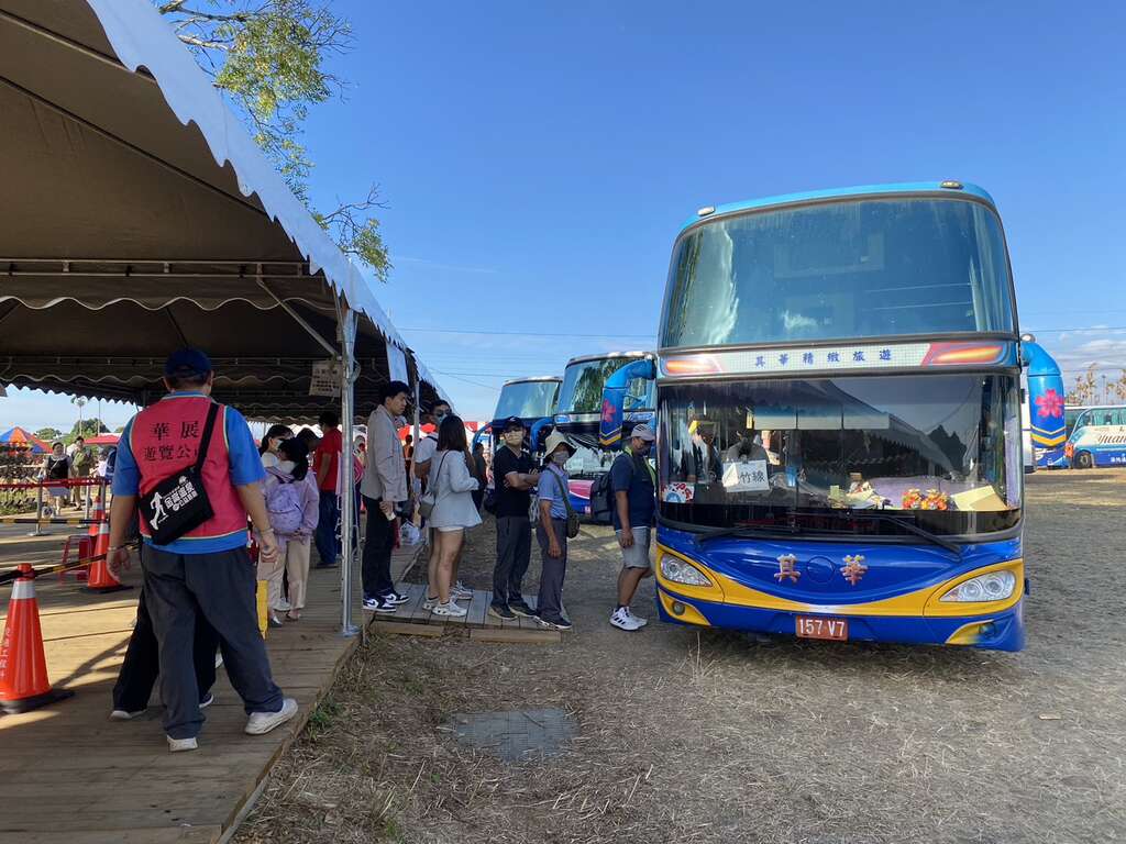 葉局長指出,今年規劃豐原線、太原線、松竹線、東勢線(假日線)、及會場環線(假日線)5條接駁路線,各路線接駁車分別自豐原轉運中心(第六月台)、太原(祥和)停車場、捷運松竹站、東勢河濱公園及花海展區接駁總站發車,平日約20至30分1班、假日約15至20分1班,活動期間坐滿即開車,歡迎民眾搭乘免費接駁車前往會場!