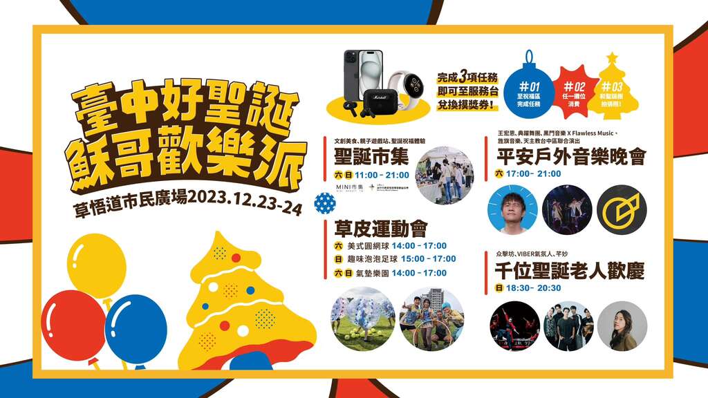 民政局表示,12月23、24日上午11時至晚上9時在市民廣場兩側(公益路側及中興街側)將設置近70個攤位的聖誕市集,集結文創美食、親子遊戲站及聖誕祝福體驗等各式攤位,下午還有草皮運動會,讓大家可以逛市集、吃美食、體驗各式戶外活動;另12月23日下午5時至晚上9時還有平安戶外音樂晚會,邀請王宏恩、典躍舞團、黑門音樂 X Flawless Music、旌旗音樂、天主教台中區帶來精彩演出。