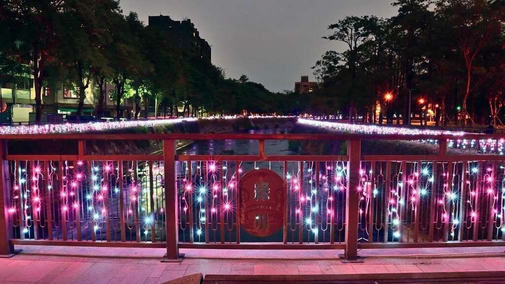 水利局表示,綠川興大段(學府路-忠明南路)位於南區中興大學旁,自109年完工啟用以來,在各項工程設計及景觀空間競賽中屢獲佳績,為得獎常勝軍,綠川興大段在白天除可讓小朋友在複層林間嬉戲尋覓,今年為迎接耶誕節到來,在綠川興大段也配合上游設置燈飾,在夜間搭配不同顏色冰條燈,附掛在河岸兩側欄杆上,共分四段,有藍白燈、粉白燈、彩色燈及金色燈四個燈區,點點亮光映在清澈的綠川河面上,彷彿在森林中透出許多螢光,為夜晚增添過節浪漫氛圍。