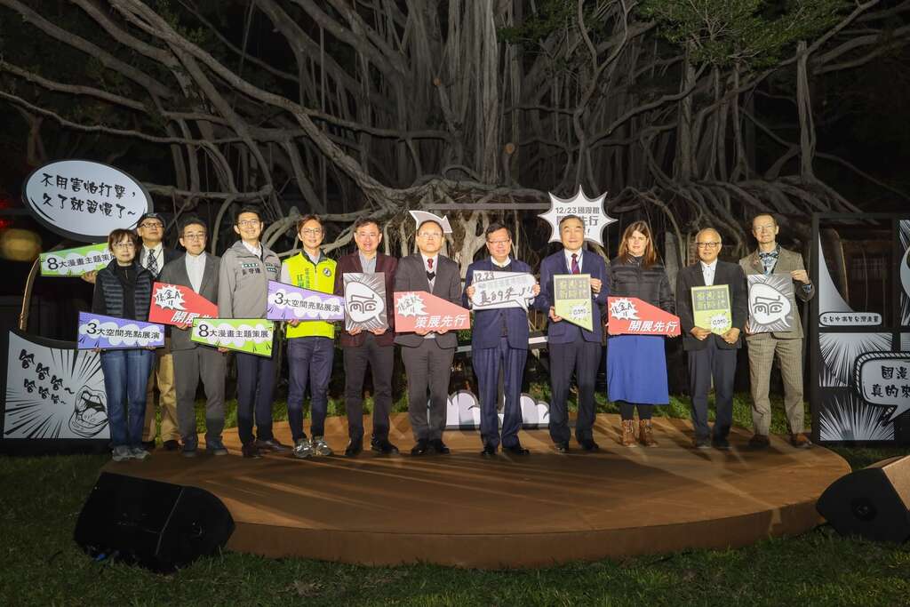 台中市政府積極推動動漫產業,今年4月成功爭取「國家漫畫博物館」落腳台中刑務所官舍群,並與文化部攜手合作,利用短短8個月做足開展前作業,將於明(23)日迎來盛大開館。行政院副院長鄭文燦、文化部長史哲及台中市副市長黃國榮等人今晚出席國漫館園區「大樹榕光」點燈儀式暨試營運記者會,一同見證台灣漫畫發展的新里程碑。