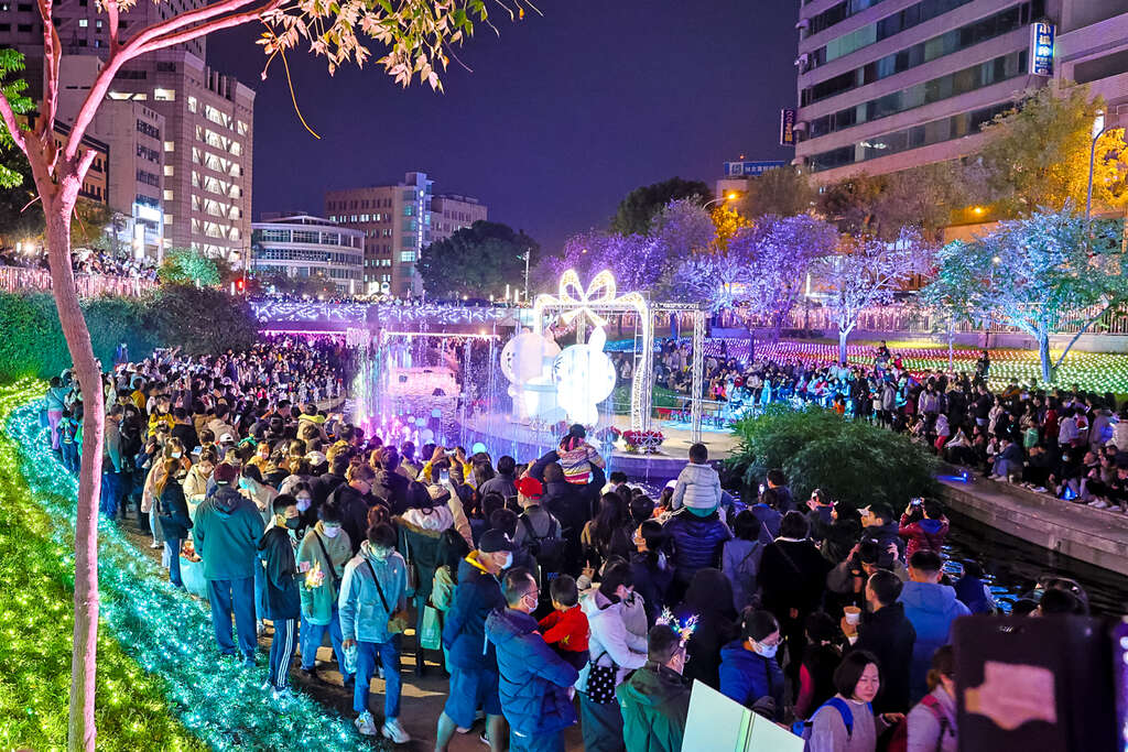 新聞局說明,今年台中耶誕大升級,首次攜手LINE FRIENDS打造主題燈飾,開展前就引發關注,而且擴大燈區,內容更豐富,不只有高達16公尺的旋轉耶誕樹,也推出絢麗浪漫的水舞燈光秀,每日展演時間未到,現場就擠滿拍照打卡的觀眾。來訪民眾一邊欣賞美麗可愛的耶誕燈飾、一邊索取美食地圖,探訪周邊名店美食、買伴手禮、逛耶誕市集,滿足視覺與味覺的雙重享受。