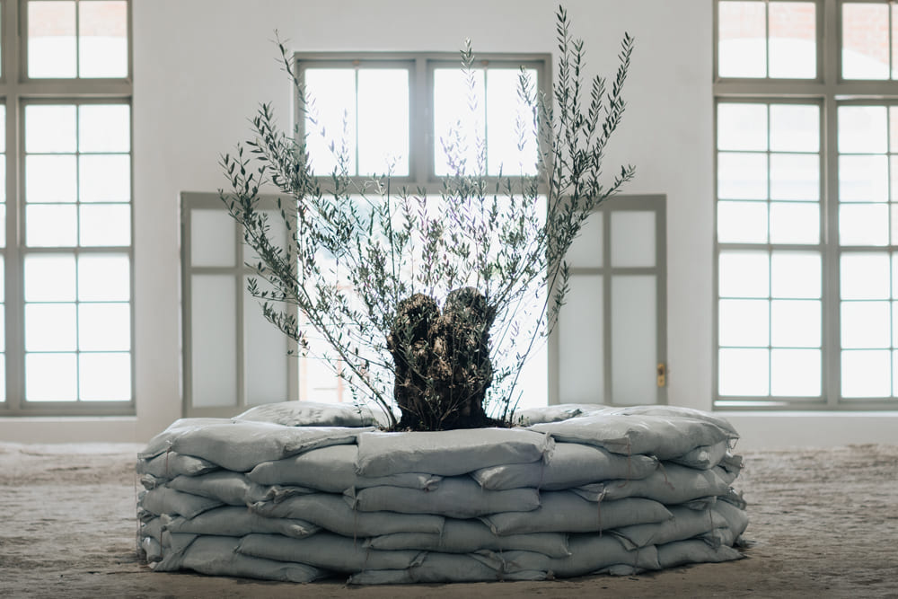 李處長說,此次展覽中還有一個彩蛋,原來州廳北側建築一樓室內藏有一處像是地下碉堡的構造物,修復工程拆除後期增設的架高地板,才發現露出防空洞的頂部。策展人靈光一閃,在此空間設置象徵愛與和平的橄欖樹作品,邀請大家一探究竟。