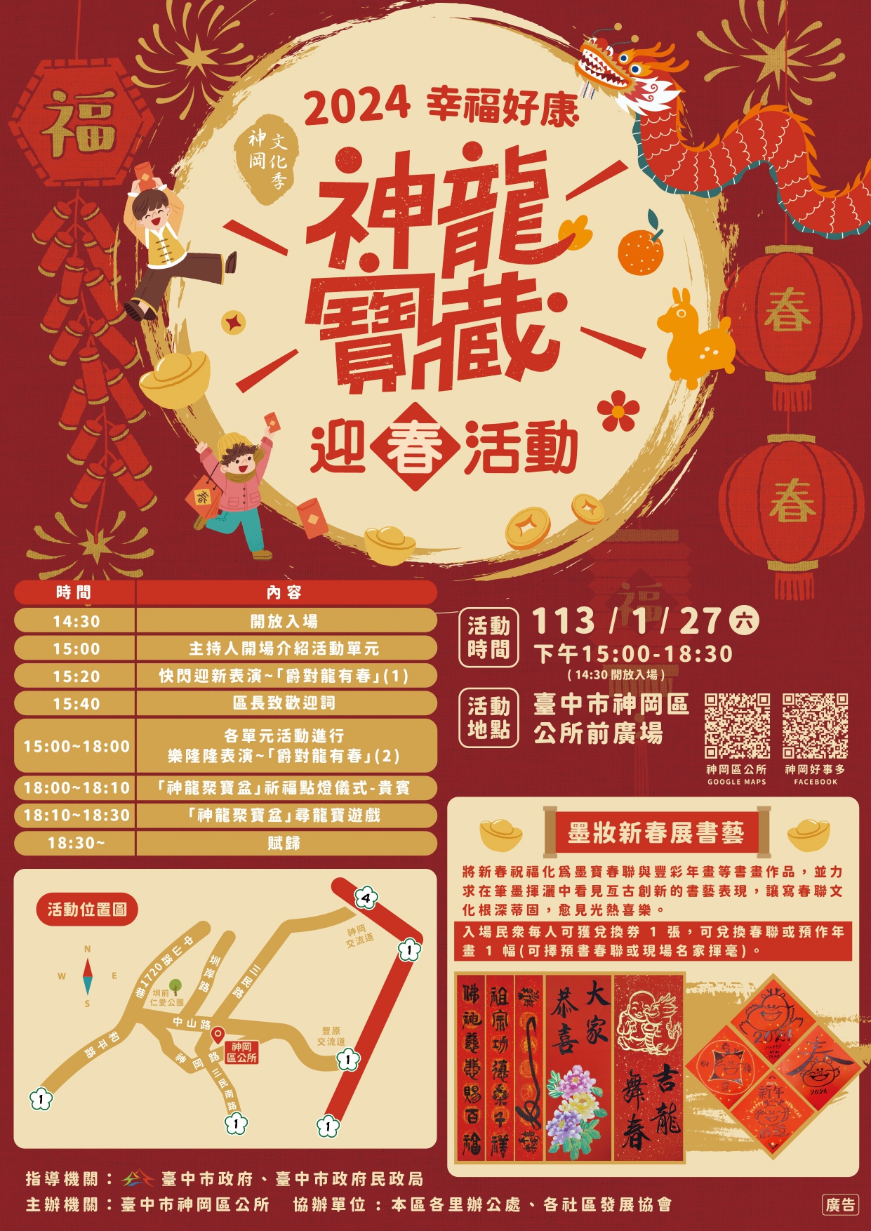 活動訂於113年1月27日(六)15時至18時30分,在神岡區公所廣場(神岡區神岡路30號)舉辦。2024神岡文化季首發~『幸福好康.神龍寶藏』迎春暨市政業務宣導活動訂於113年1月27日(六)15時至18時30分在神岡區公所前廣場登場,歡迎龍來逗鬧熱,點亮「龍」光、好運龍 厚哩!相關照片