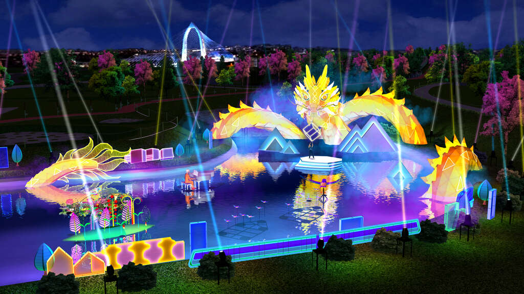 觀旅局長陳美秀表示,今年「台中龍賀」主燈由國際知名藝術家江元皓設計,中央公園整個水域將成為大型舞台,巨大的神龍巧妙融入景觀,蜿蜒伏臥在乾溼滯洪池的邊界,並由音樂家林佳儀與吳俊誼量身打造原創音樂,搭配水上載具拉開主燈秀光影交織的夢幻篇章,搭配表演團隊「狂夢藝術」立方體舞者登場,精湛的表演將發光立方體轉化為璀璨的「龍珠」,跟著燈光音樂上下轉動,像是跟龍燈嬉戲般在空中進行拋接動作,讓台中的水上主燈成為今年全台燈會最引人注目的亮點。