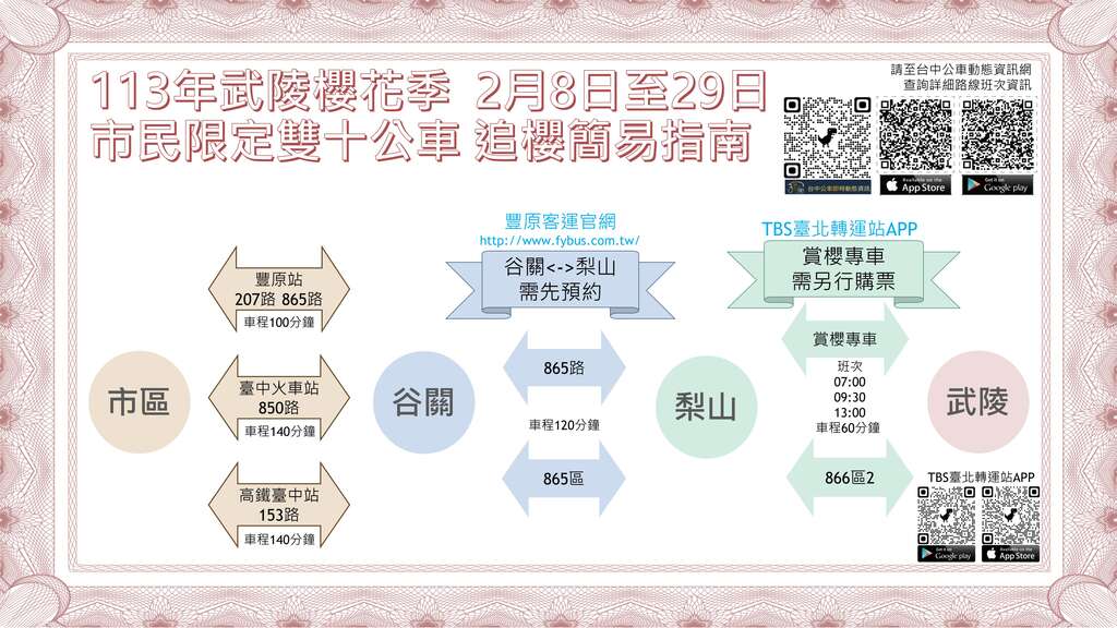 交通局表示,每年武陵櫻花季吸引眾多人潮,民眾可提前透過網路或電話預約豐原客運865路(含區)公車前往梨山、次日再轉乘以「TBS台北轉運站」APP預約的「梨山-武陵農場」賞櫻專車前往武陵農場,台中市民搭乘865路公車享有雙十公車優惠,前10公里免費,超過10公里最多只收10元車資,歡迎市民提前預約購票安心出遊,快樂賞花。