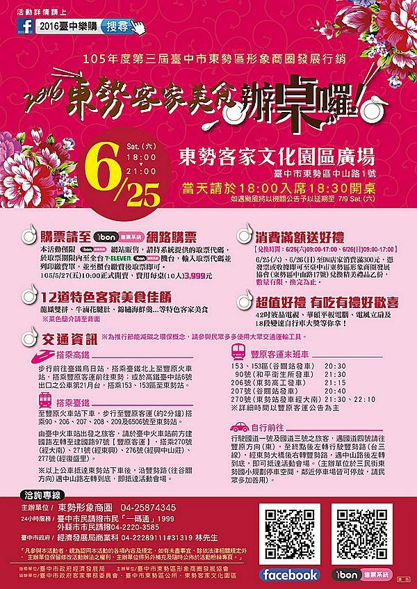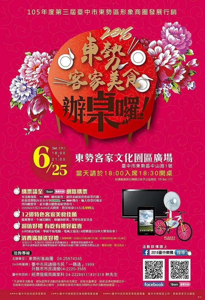 由臺中市東勢區形象商圈發展協會主辦的「東勢客家美食 辦桌囉!」活動,將於105年5月27日(星期五)上午10點起於IBON網路購票系統熱烈開賣售票,本次活動是以席開百桌宴請千人的方式來宣揚東勢客家的文化特色,集結在地10家特色店家於6月25日在東勢客家文化園區共同端出各自的拿手料理,12道美味道地的客家特色美食一桌僅需3999元,除品嚐美食外,至DM店家消費還有滿額贈禮,活動當日還可觀賞精彩節目,更有機會將42吋液晶電視、平板電腦、變速自行車及電扇等大獎帶回家,邀請全國民眾踴躍來報名。
