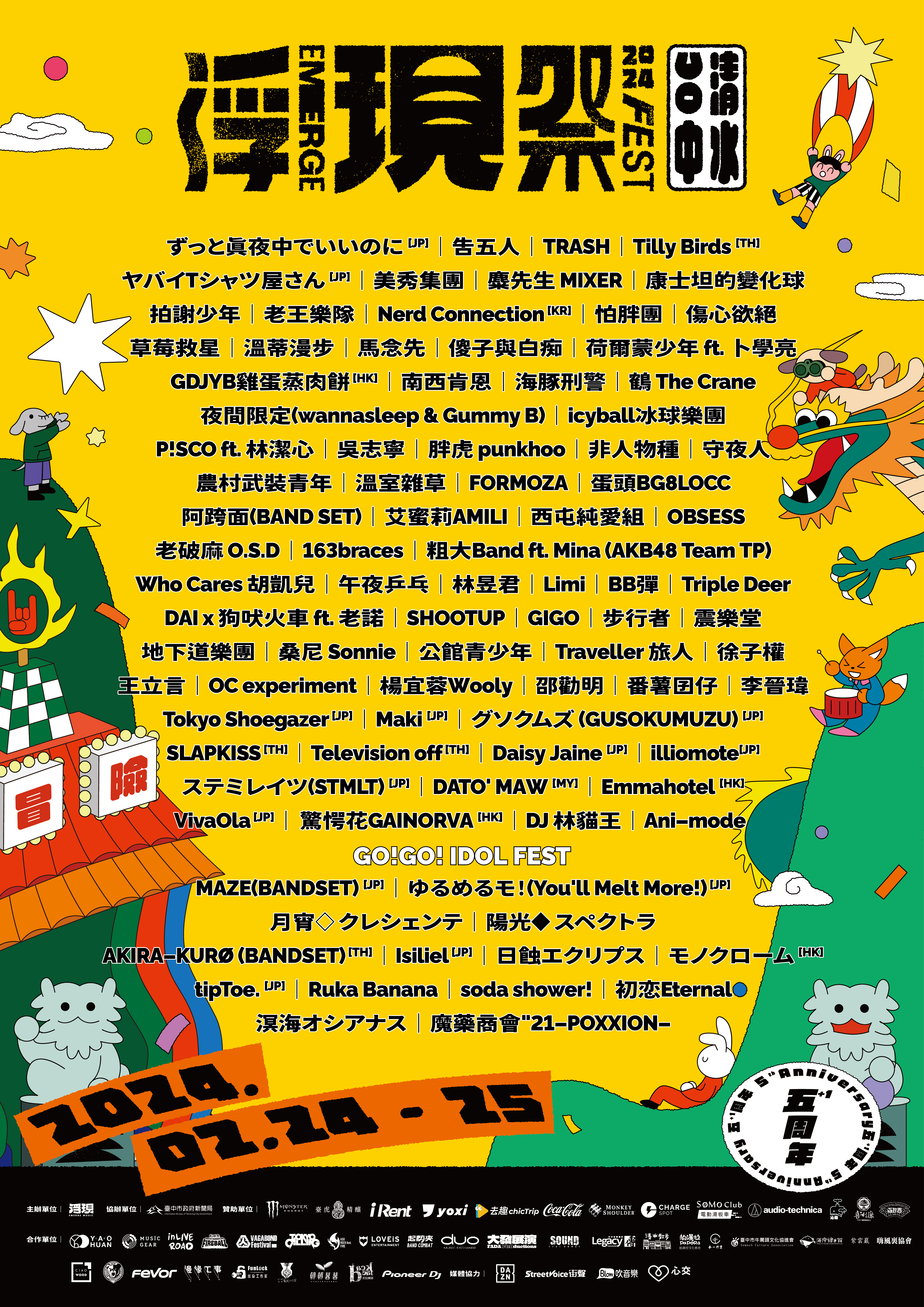 浮現音樂主辦單位說明,主活動陣容涵蓋來自台、港、日、泰、韓、馬等多個國家地區的眾多藝人,包括ずっと真夜中でいいのに。[JP]、告五人、TRASH、Tilly Birds [TH]、ヤバイTシャツ屋さん [JP]、美秀集團、麋先生 MIXER、康士坦的變化球、拍謝少年、老王樂隊、Nerd Connection [KR]、怕胖團等將超過八十組藝人。活動相關訊息可至浮現祭臉書專頁查詢https://www.facebook.com/emergemusicfest/。
