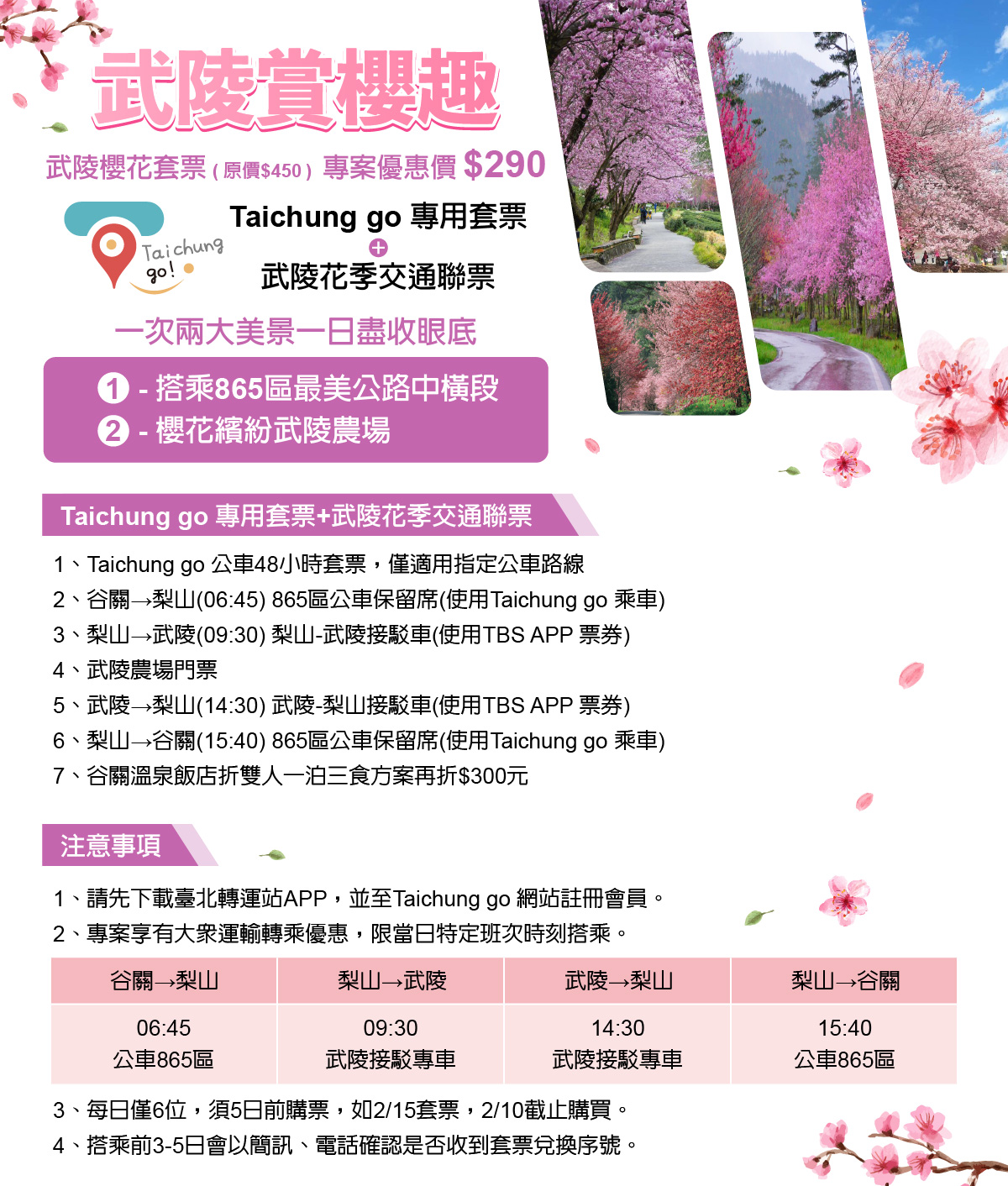 交通局長葉昭甫表示,武陵農場擁有得天獨厚的天然環境,為台中市的熱門景點,一年一度櫻花季即將於2月8日至2月29日登場,農場內廣植約3萬株櫻花,開闢10大賞櫻景點,其中今年首推3大賞櫻秘境,包括觀月亭、露營區草原旁櫻花秘境及藤花園秘境,交通局特別推出「Taichung go套票×武陵花季交通聯票」,包含Taichung go 48小時公車套票(含台中市公車865路保留席)、梨山-武陵來回接駁車、武陵農場門票與享有谷關飯店住宿優惠等。