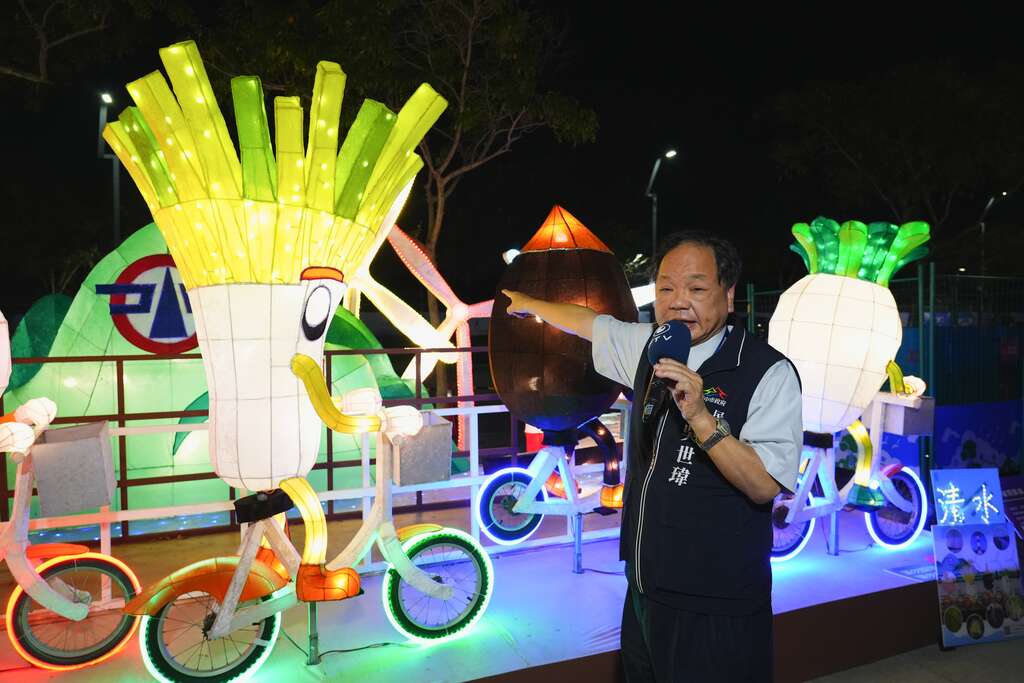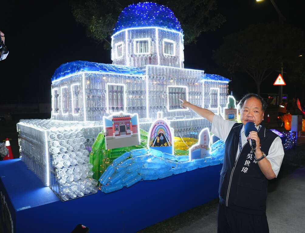 吳局長說明,「Party 龍」展出花燈為此次各燈區中燈組最多,設計理念更融入11項SDGs指標,花燈材質的使用既多元又兼顧環保,像是龍井區公所利用4,200個回收寶特瓶及潮間帶廢棄物等環保素材堆疊燈組主體,打造麗水漁港知名地標「台中小希臘」地中海風情塔樓;另后里區公所則使用再生材料高接梨嫁接殘枝製作地景馬車,成功結合地方農產特色及實踐環境永續,亮眼吸睛。