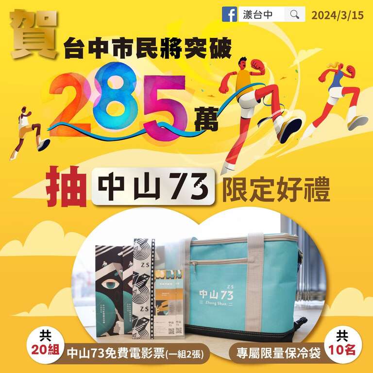 新聞局表示,為慶祝台中市總人口數突破285萬大關,規劃由「中山73」送出優質好禮。方案一、民眾追蹤「漾台中」及「中山73」臉書粉絲專頁後,到「漾台中」粉專按讚活動貼文,標註兩位好友並留言指定通關密語即可參加抽獎,將從中抽出20人獲得中山73免費電影票(一組2張)、10人獲得專屬限量保冷袋,共抽出30名幸運兒;方案二、民眾到中山73現場持活動手板拍照打卡,並標註「賀台中市民突破285萬我在中山73看電影」,前80人即可獲得電影票組,3月16日(週六)起開放現場贈票活動,數量有限贈完為止。
