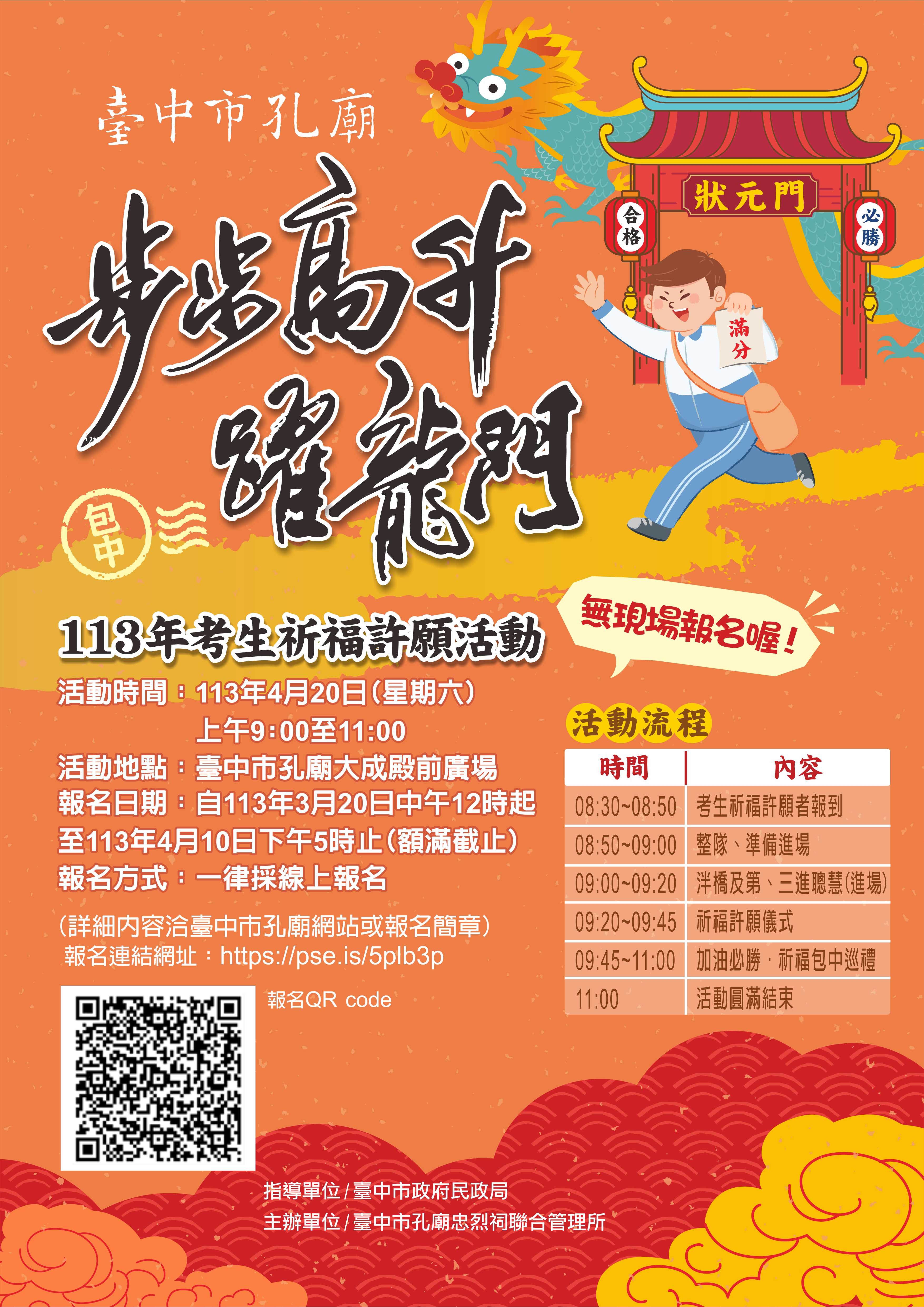 台中孔廟所長李書華表示,今年祈福活動報名方式一律採取「網路報名」,祈福儀式更結合祭孔經典儀程,讓考生虔心祈求至聖先師庇佑考運順遂,活動更首度布置祈福步道,期盼大家通過泮橋及甬道三進門(聰明門、龍門、狀元門),都能添好運、高中狀元。此外,今年特別邀請中部多所大學設置未來志向諮詢攤位,提供考生諮詢;現場更規劃茶席及咖啡區,邀請專業茶藝師、咖啡達人現場泡包中茶及沖煮咖啡,提供考生享用、放鬆心情;另「步步高升躍龍門」拍照區,則可讓考生和親朋好友拍照留念。